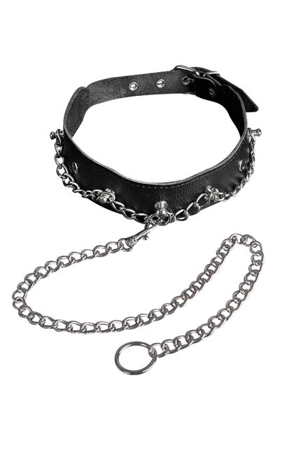 Цепь-поводок интегрирована в конструкцию ошейника: просто закрепите кольцо на нужном уровне. Мягкая внутренняя поверхность предотвращает натирание, а классический черный цвет легко комбинируется с другими элементами образа.