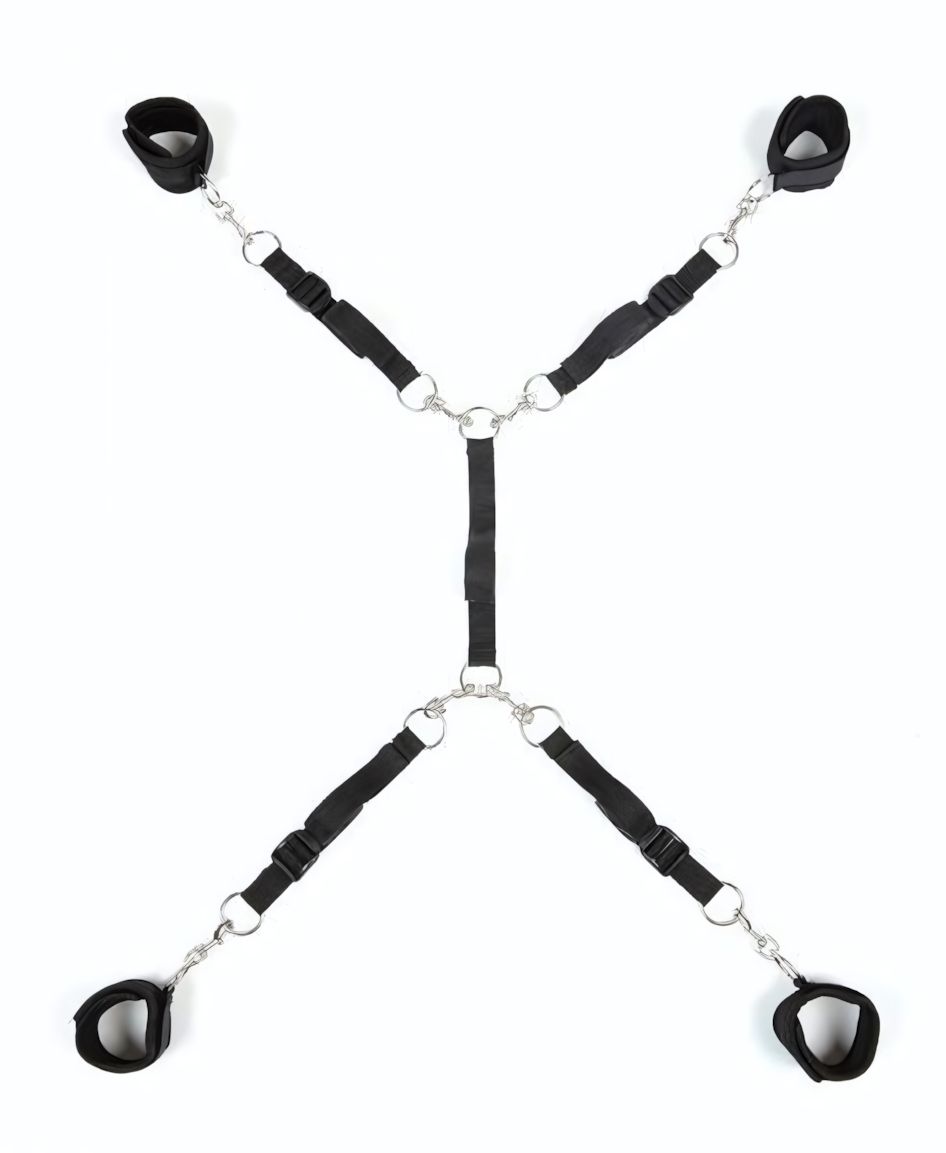 Центральная система креплений равномерно распределяет нагрузку, позволяя зафиксировать партнёра в нужном положении. Поворотные зажимы обеспечивают моментальное освобождение одной рукой. Регулируемая длина ремней (от 40 до 120 см) подходит для людей любого телосложения.