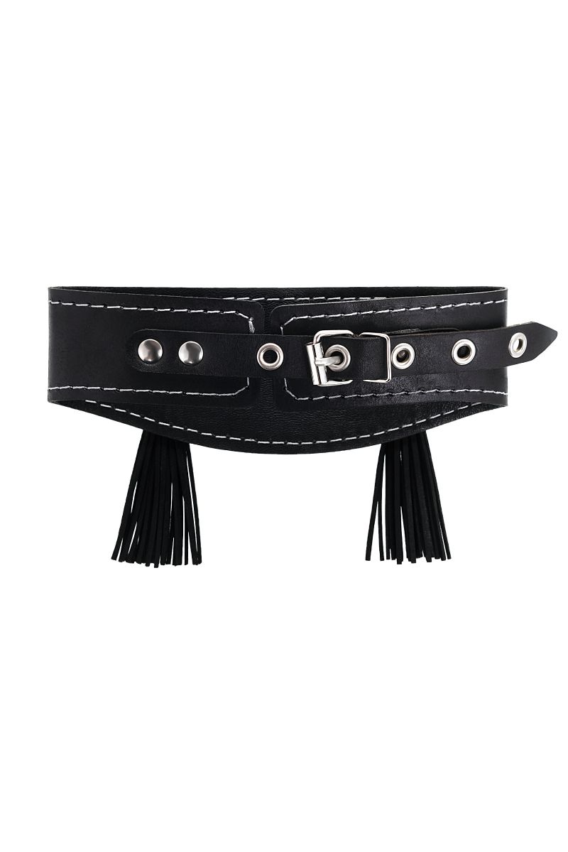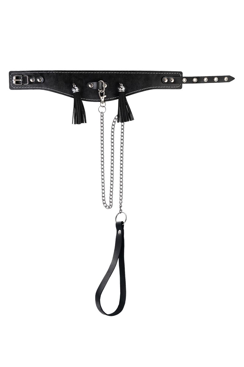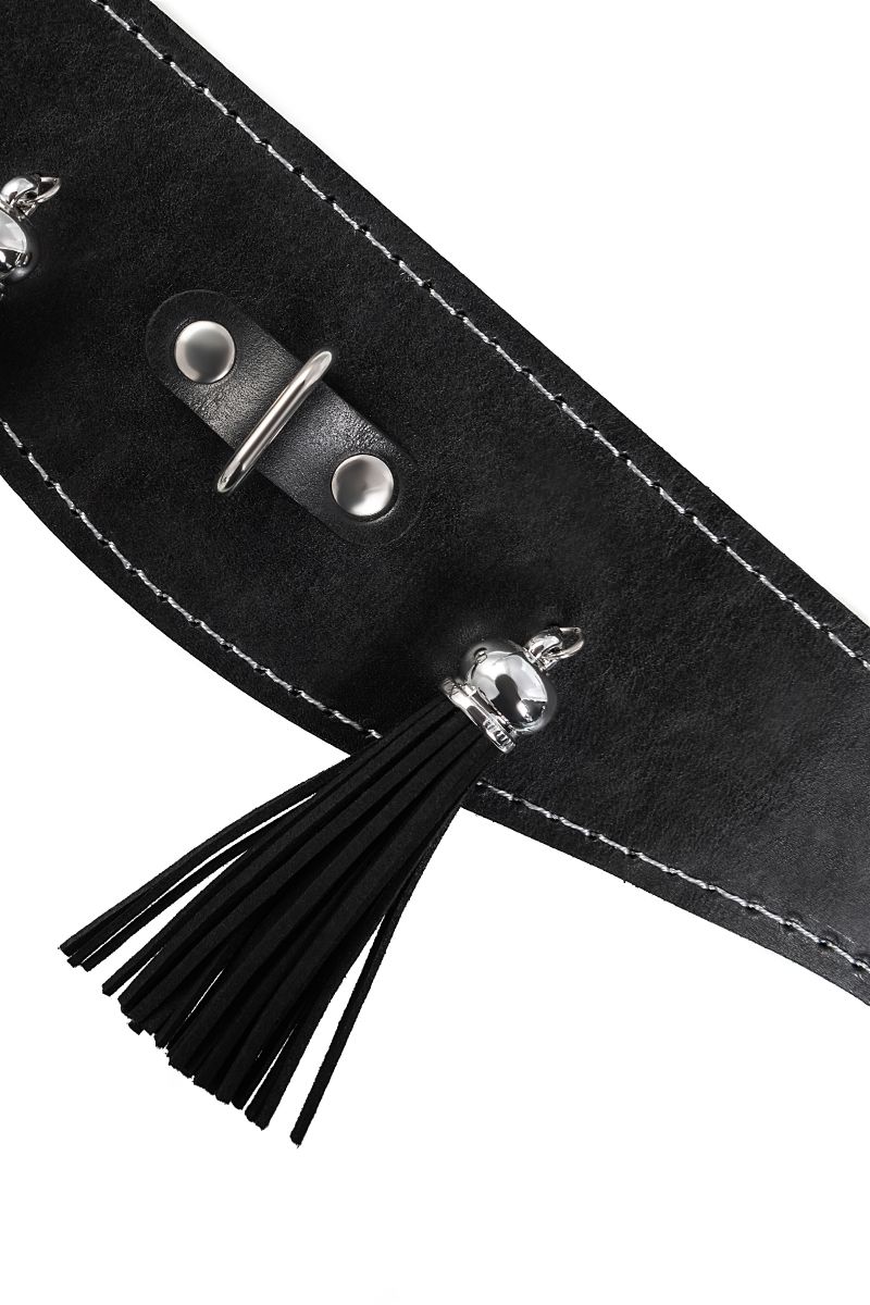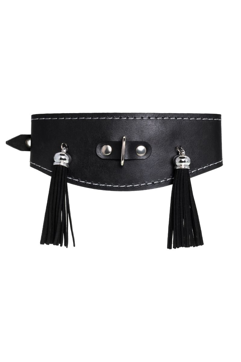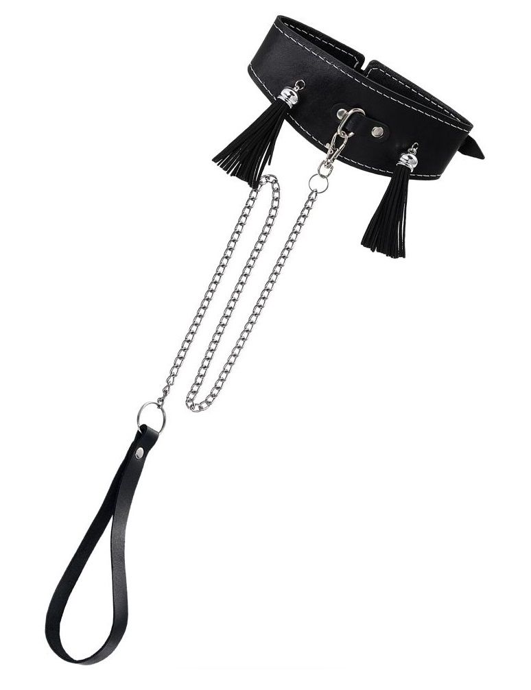 Ошейник для взрослых с кисточками и цепочкой, черный, натуральная кожа, ширина 4 см, длина поводка 80 см