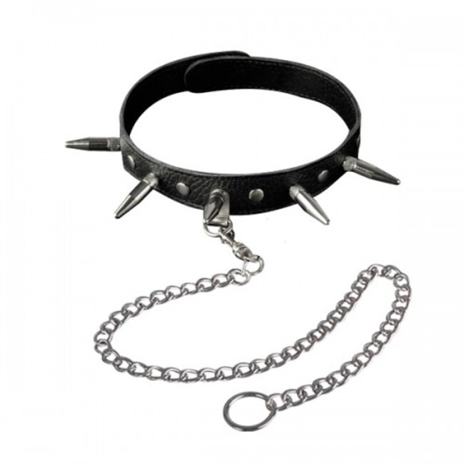 Ошейник кожаный с шипами и цепочкой, черный, велюровая подкладка, 20 мм ширина, 50 см цепь