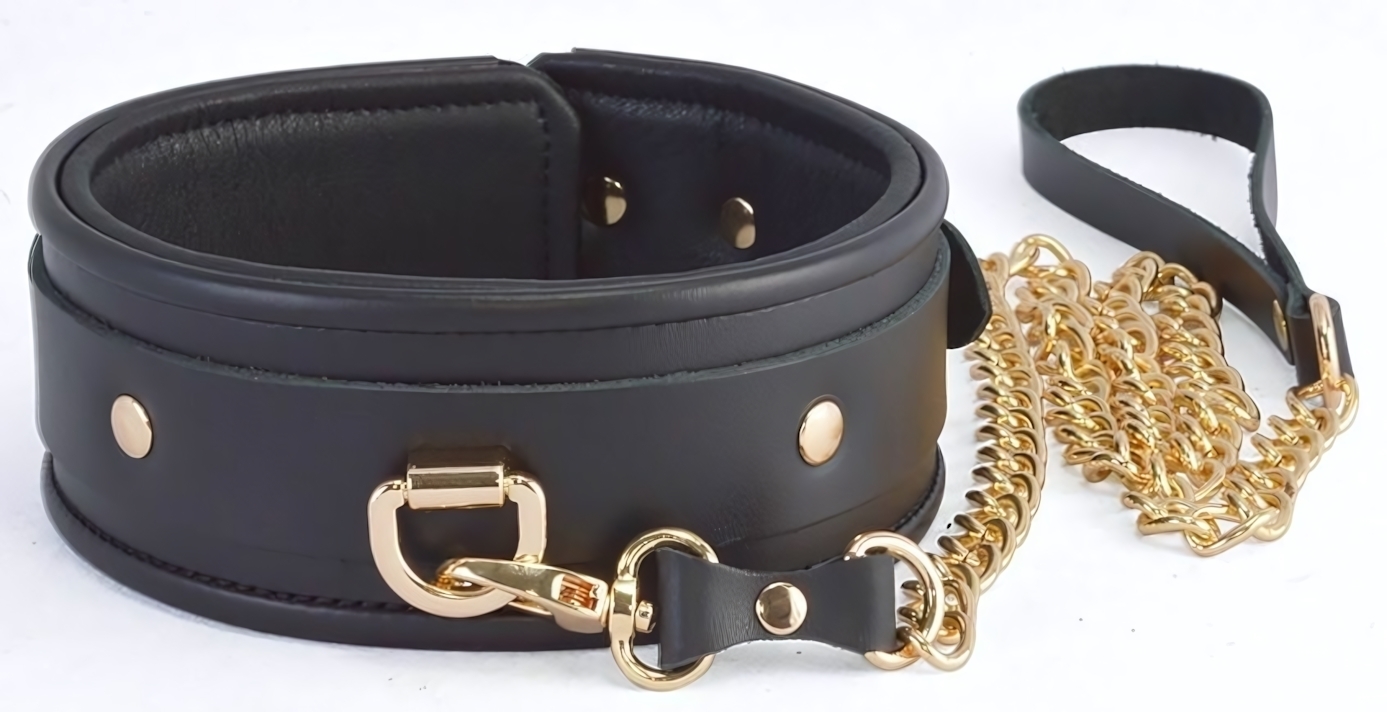 Ширина ошейника составляет 5,5 см, а длина поводка — 90 см. Цветовая гамма черного с золотистым делает его универсальным аксессуаром, который легко сочетать с различными нарядами. Внутренняя сторона выполнена из мягкой искусственной кожи, что обеспечивает комфорт при ношении. Этот ошейник станет отличным дополнением к вашей коллекции BDSM-аксессуаров и поможет создать незабываемую атмосферу в ваших играх.