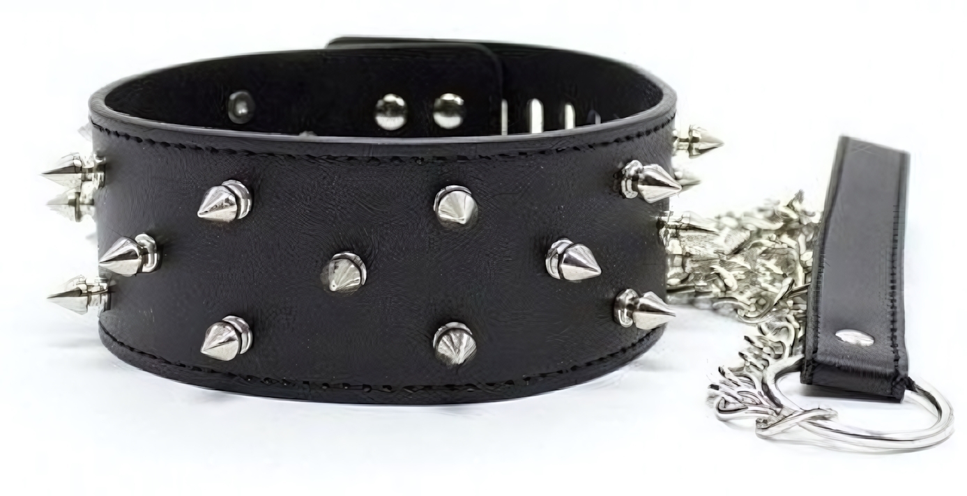 Комплект включает ошейник с декоративными шипами и поводок с карабином. Материалы: сочетание экологичной искусственной кожи и нержавеющего металла. Цветовая гамма выполнена в классическом черном оттенке, который подчеркивает статусность аксессуара.