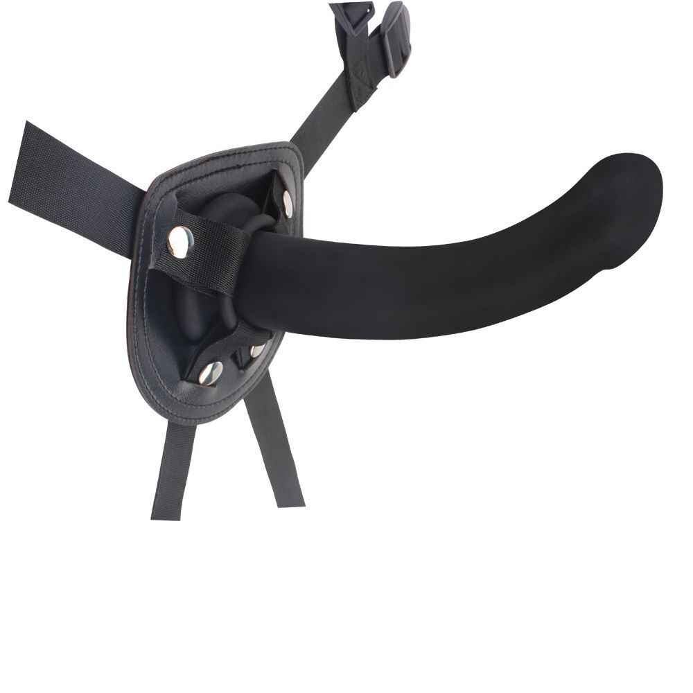 Страпон имеет черный цвет и выполнен из гладкого силикона, что придает ему стильный и современный вид. Его изогнутая форма позволяет легко достигать нужных зон, обеспечивая максимальное удовольствие. Этот товар станет отличным дополнением к вашей коллекции интимных аксессуаров и поможет разнообразить вашу сексуальную жизнь.