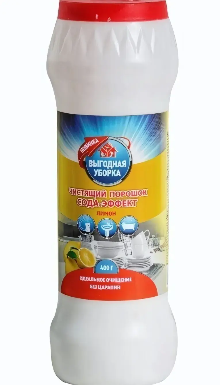Упаковка имеет светло-гелевую, округлую форму с плоским дном и красной крышкой, что делает её удобной для хранения. Яркий дизайн с изображением лимонов не только привлекает внимание, но и подчеркивает натуральный состав продукта. Чистящий порошок 'Выгодная уборка' — это надежное решение для вашего дома, которое сэкономит ваше время и силы на уборку.