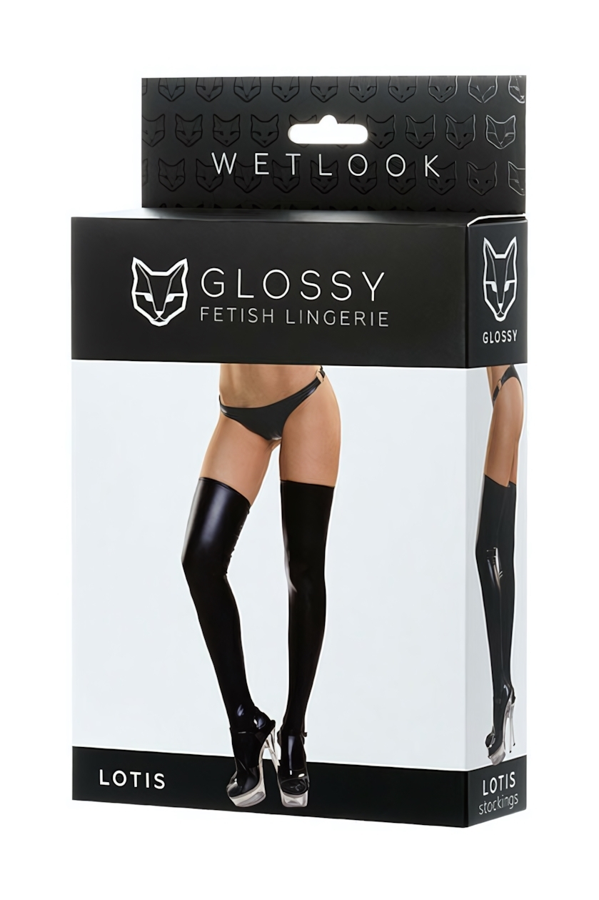 Чулки 'Lotis' с эффектом мокрого блеска создают соблазнительный силуэт и подчеркивают естественную красоту. Материал Wetlook имитирует эстетику винила, сохраняя при этом эластичность и комфорт при ношении.