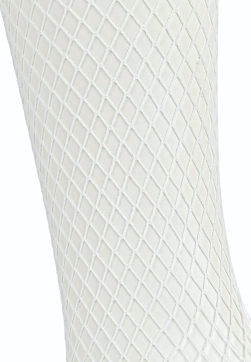 Чулки изготовлены из эластичного материала, который повторяет контуры тела и сохраняет форму в течение всего дня. Особое плетение сетки предотвращает сползание, а декоративные элементы в верхней части добавляют образу игривости. Модель совместима с разными типами подвязок и поясом для чулок.