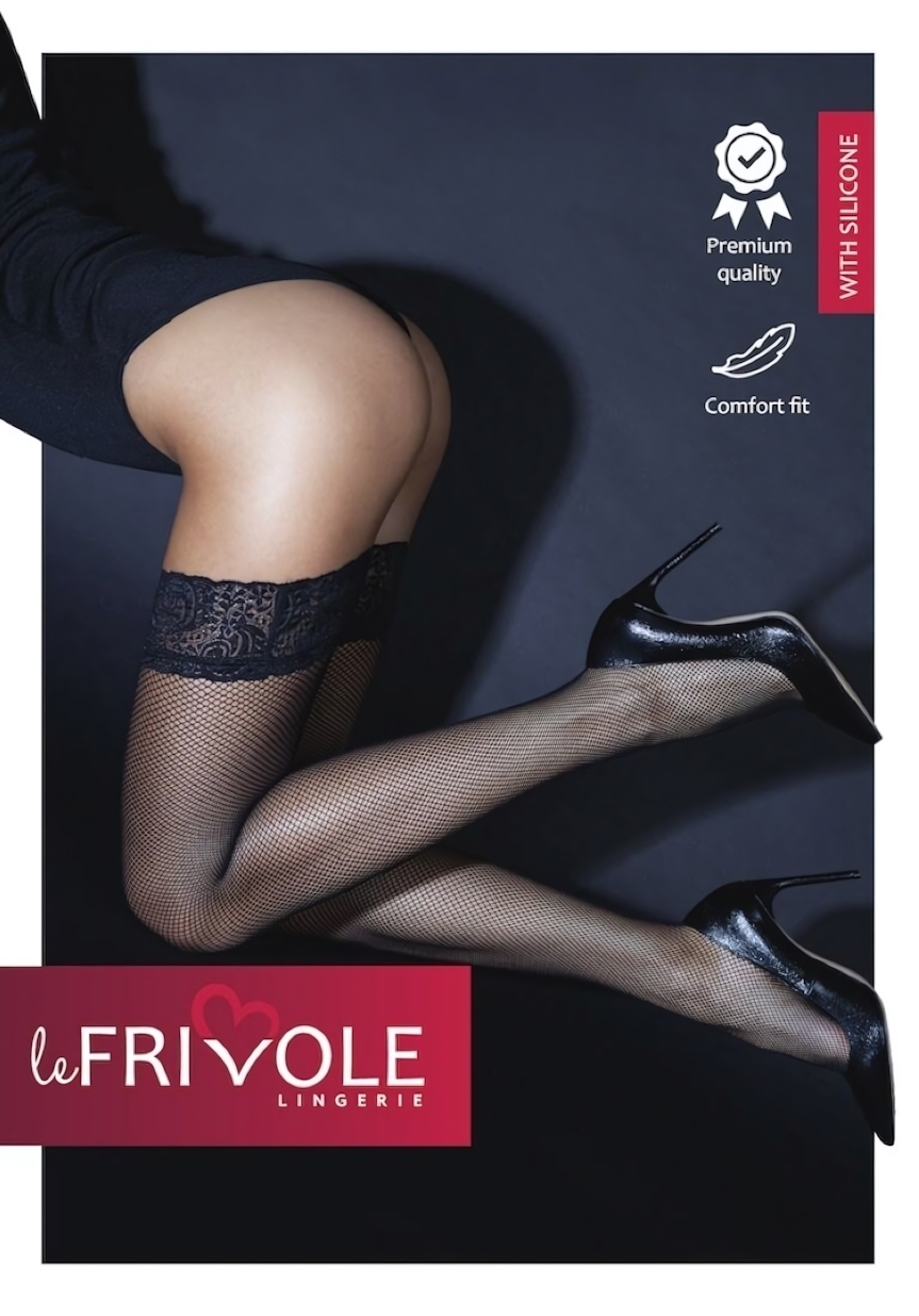 Чулки Le Frivole сочетают изысканный дизайн с практичной функциональностью. Мелкая сетка и кружевная резинка создают соблазнительный образ, а силиконовая полоска гарантирует надежную фиксацию без дискомфорта.
