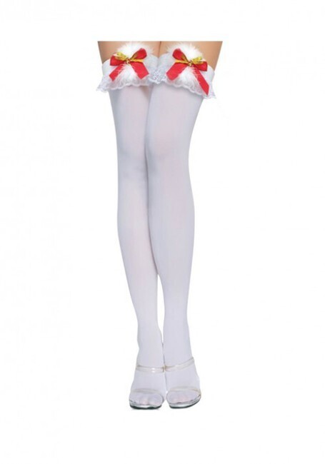 Чулки белые с кружевом и бубенчиками, размер SL (42-46), материал нейлон/спандекс