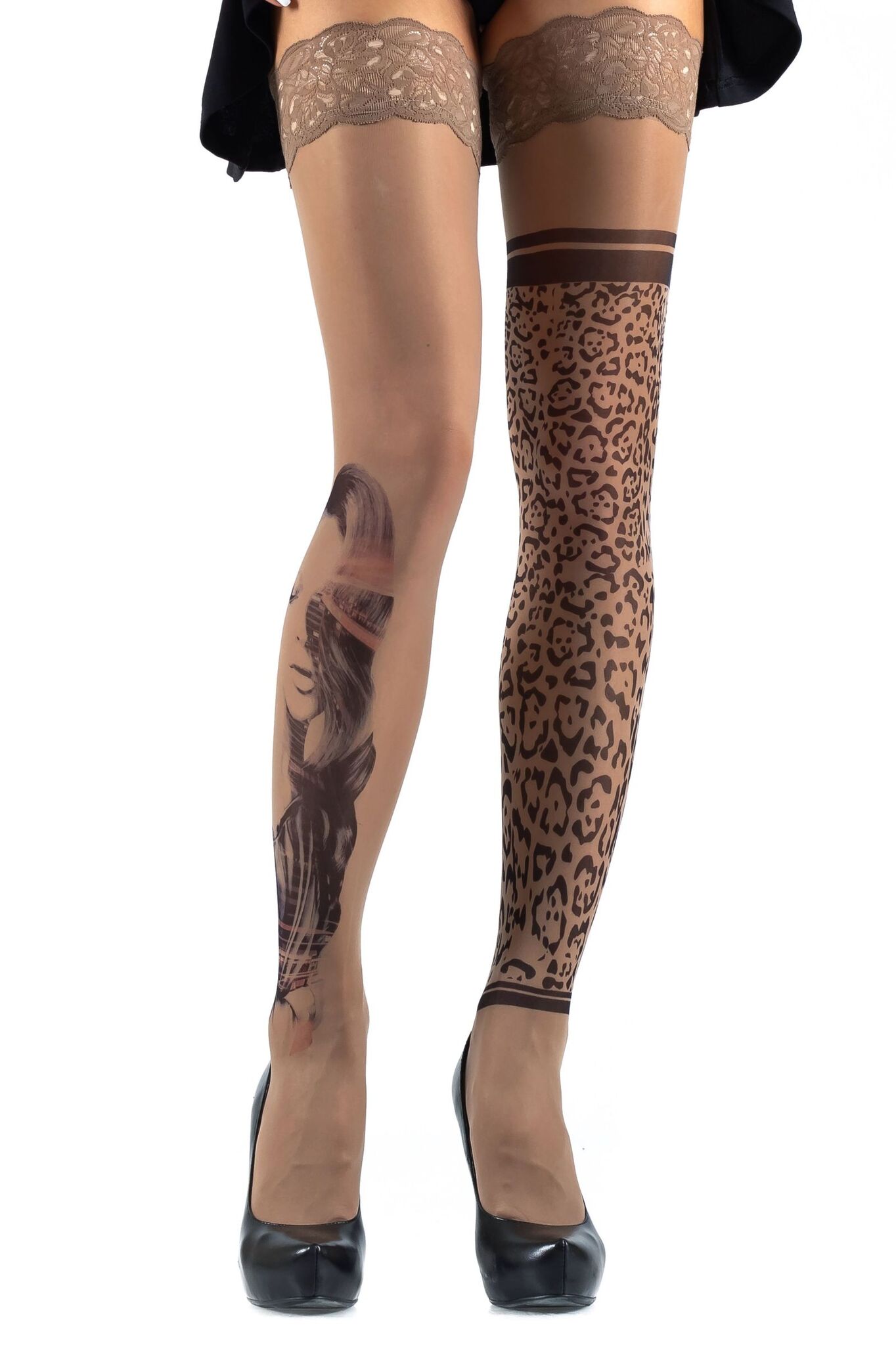 Погрузитесь в мир стиля и комфорта с нашими чулками, которые не только подчеркнут вашу индивидуальность, но и добавят изюминку в любой наряд. Эти чулки с оригинальным принтом, где одна нога украшена изображением женщины, а другая — леопардовым узором, создают эффект 'второй кожи', что делает их идеальным выбором для уверенных в себе женщин.