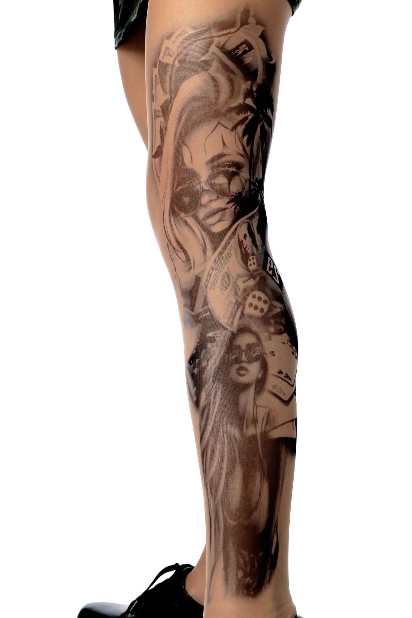 Чулки с эффектом татуировки подчеркнут вашу индивидуальность и добавят загадочности. Стильный принт с девушками, денежными купюрами и игральными костями выглядит как настоящая татуировка.