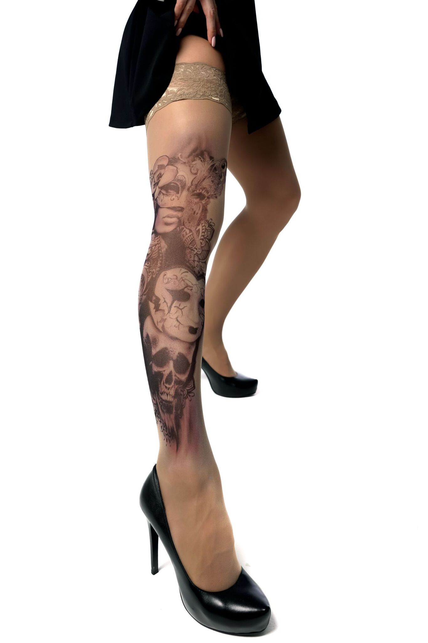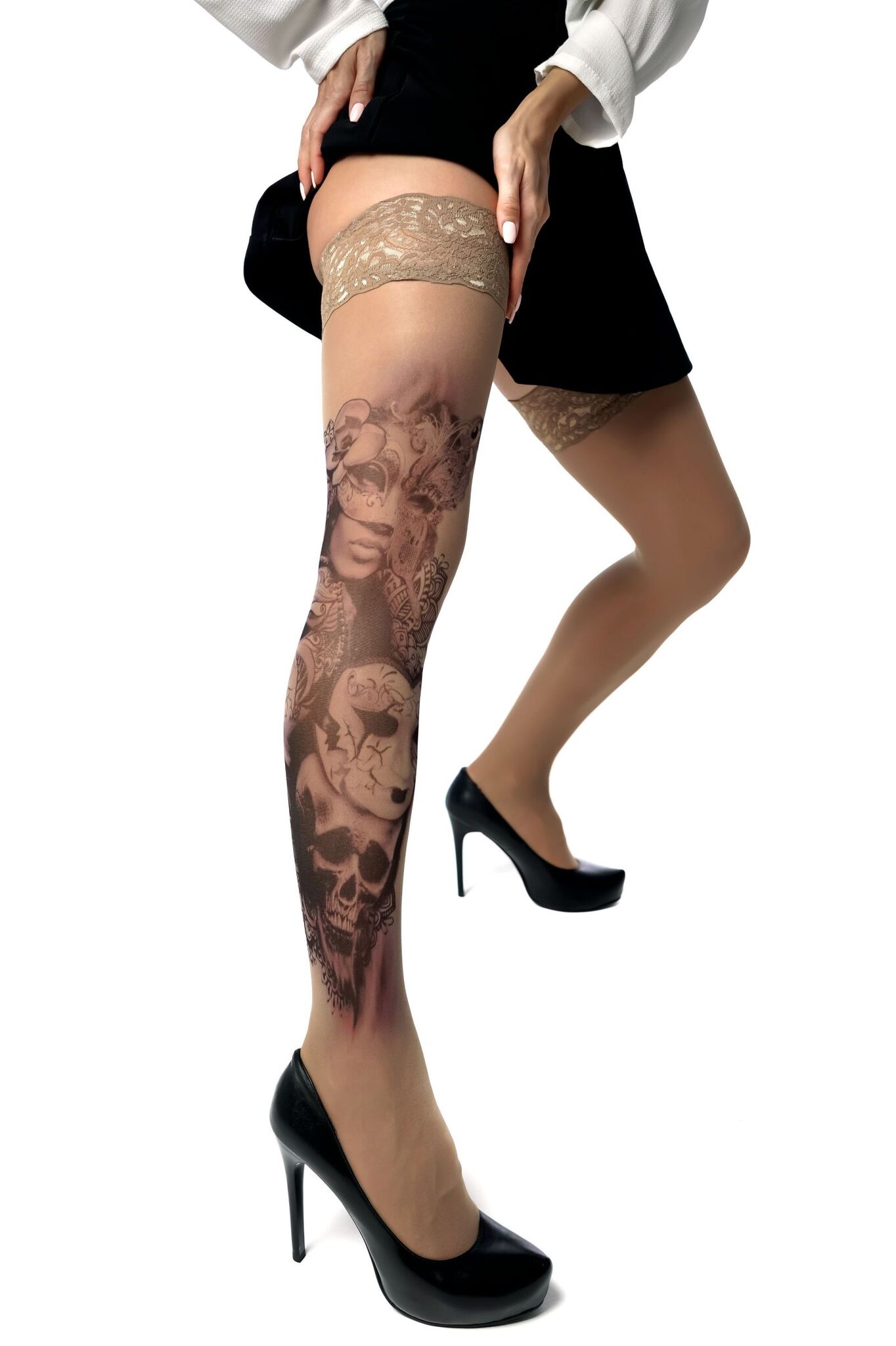 Чулки с тату-принтом 'девушка в маске', размер S-M-L, цвет бежевый, плотность 40 ден