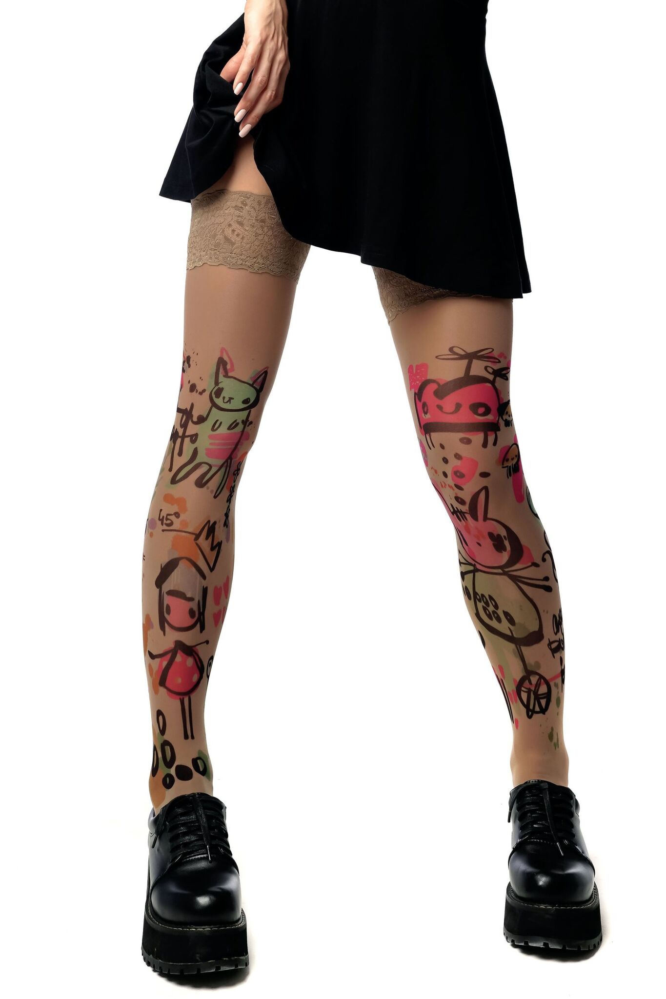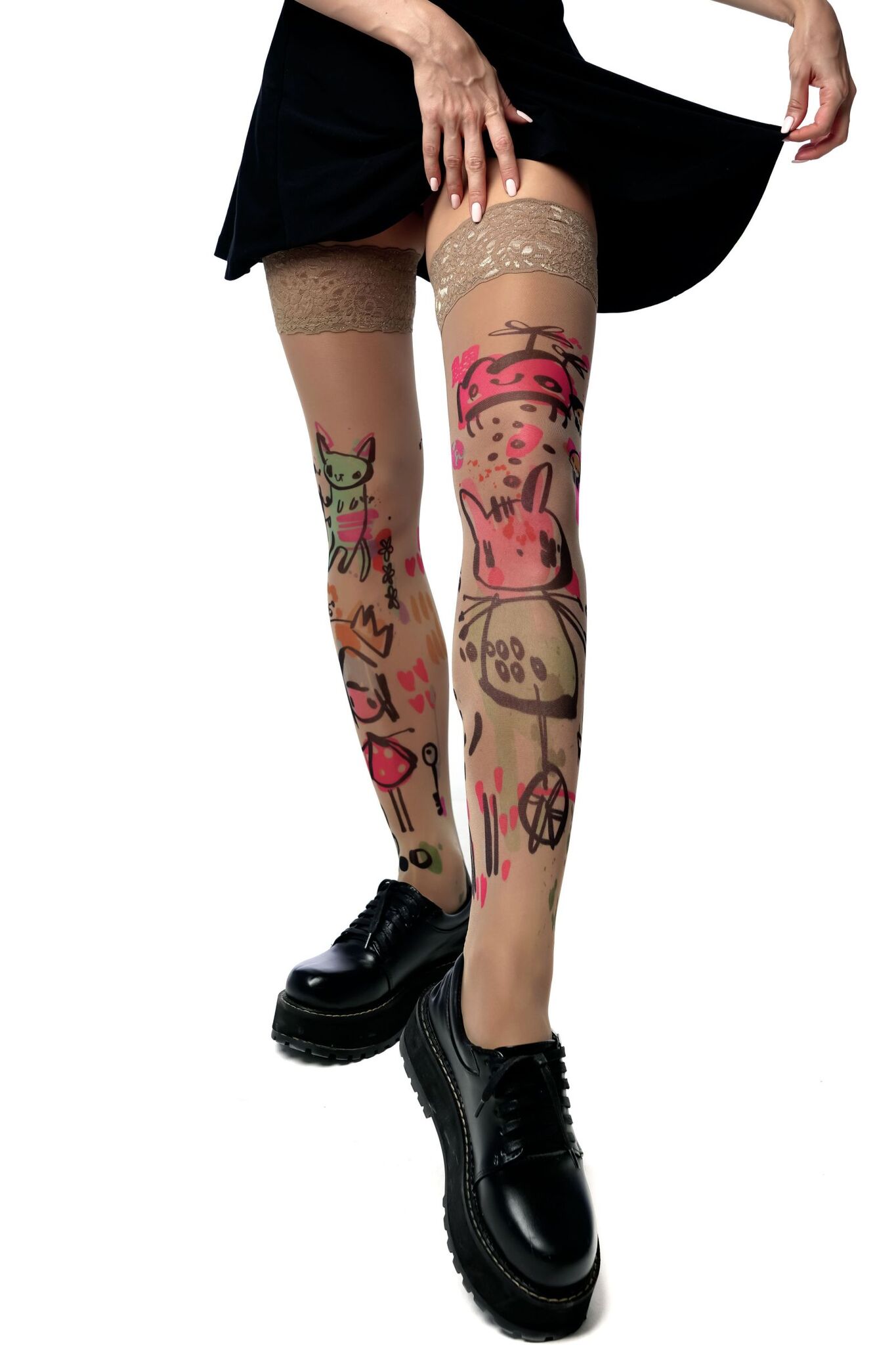 Эти чулки с уникальным принтом в виде цветных зарисовок станут отличным дополнением к вашему образу. Они не только привлекают внимание, но и обеспечивают комфорт и удобство в носке. Благодаря высококачественному материалу, чулки выдерживают многочисленные стирки, сохраняя яркость принта и его оригинальный вид. Принт выглядит как настоящая татуировка, что добавляет изюминку вашему стилю.