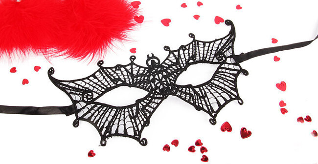 Изысканное ажурное плетение создает эффект кружевной паутины, а контрастные декоративные элементы в виде алых сердец добавляют игривости. Центральный акцент в форме паука и объемное перо делают маску самостоятельным арт-объектом.