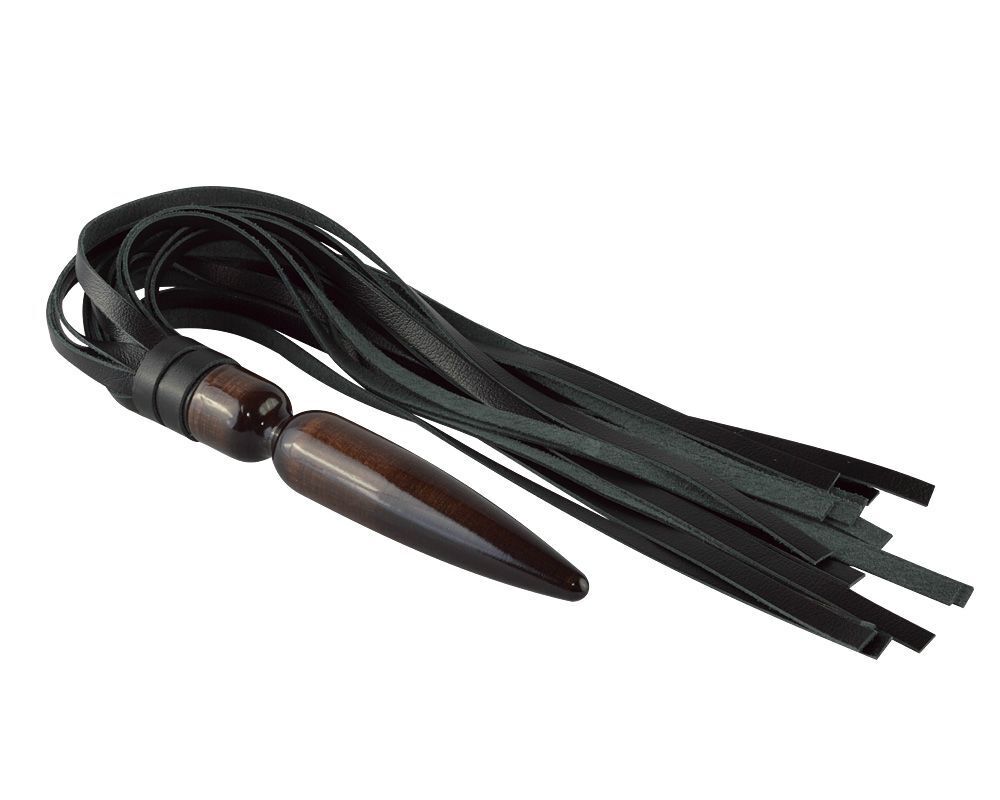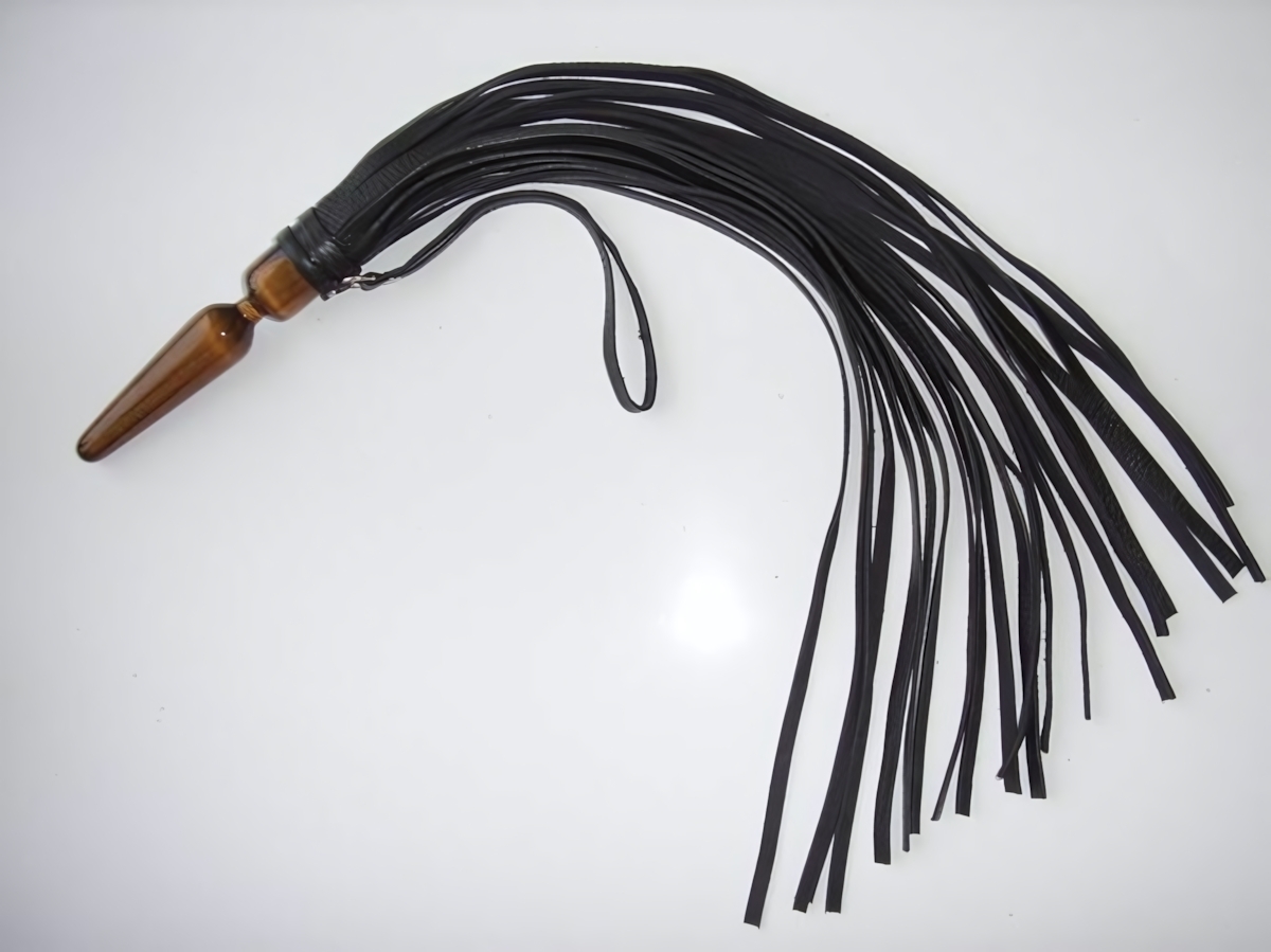 Плеть кожаная для БДСМ игр, с рукоятью-анальной пробкой, 21 хвост, 60 см, натуральная кожа, черная