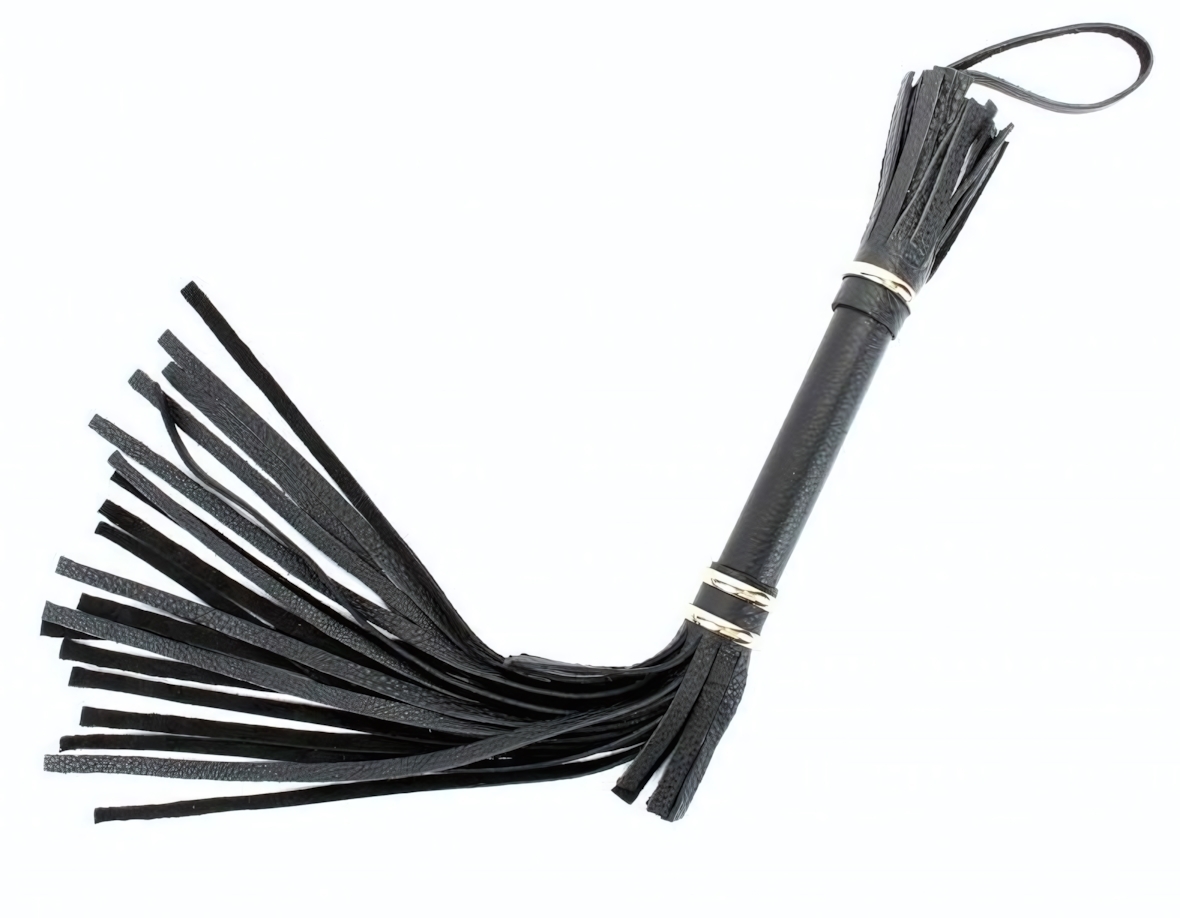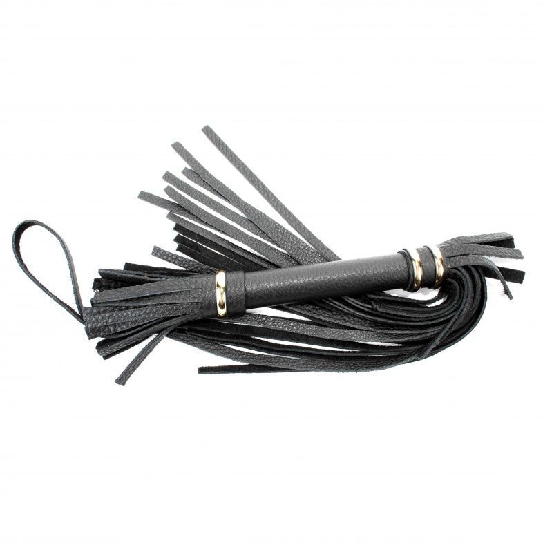 Плетка из натуральной кожи «БДСМ Арсенал», черная с золотистым, 45 см, жесткая ручка, петля для крепления