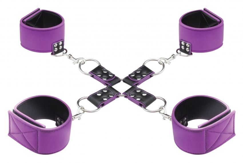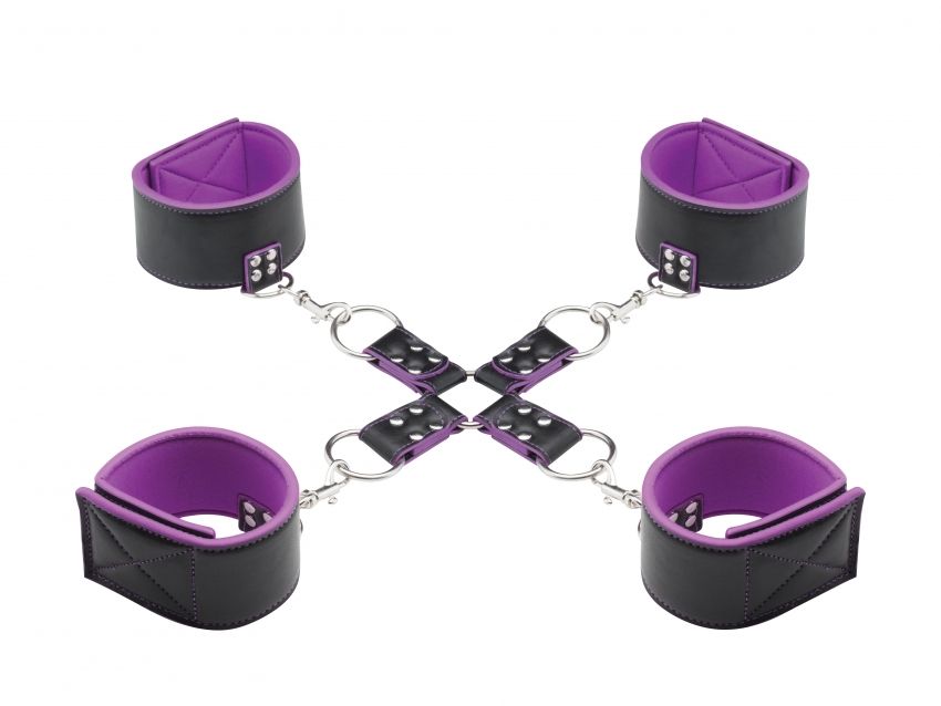 - Эргономичный центральный соединитель: Крестовидный элемент из чёрных полос с фиолетовой окантовкой и металлическими кольцами на концах равномерно распределяет нагрузку и обеспечивает стабильное положение связанных конечностей, создавая классическую и эффектную позу «хогтай» (hogtie).