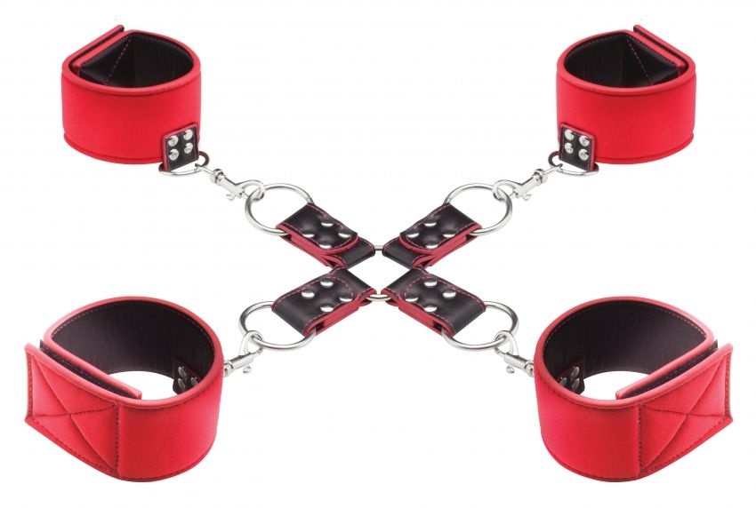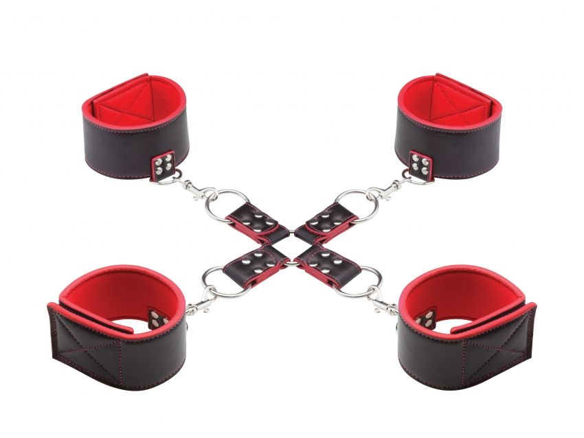 - Универсальная система крепления: Манжеты для запястий и щиколоток соединены между собой центральной крестовиной из четырех ремешков. Использование металлических колец и карабинов обеспечивает надежное соединение и позволяет быстро менять конфигурацию связывания.