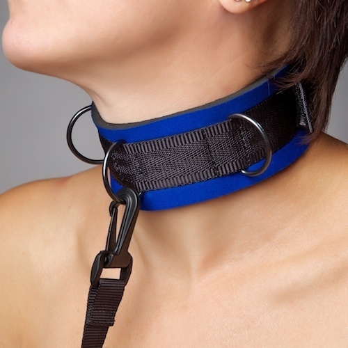 Цвет: синий с черным; Материал: неопрен. Этот ошейник станет отличным дополнением к вашей коллекции садомазохистской атрибутики и поможет создать незабываемую атмосферу в ваших играх.