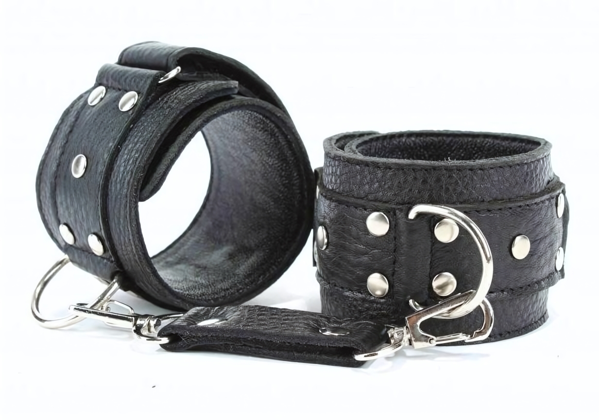 Черные наручники из натуральной кожи с металлическими заклепками и цепью созданы для комфортного использования. Регулируемая застежка-липучка обеспечивает идеальную посадку на запястье, а мягкая внутренняя отделка гарантирует приятные тактильные ощущения.