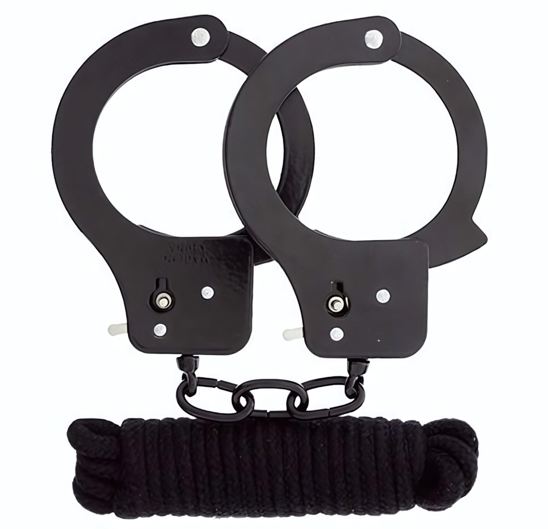 Комплект включает два металлических наручника, соединенных цепочкой, и черную текстильную веревку. Ключи для открытия наручников в комплекте.