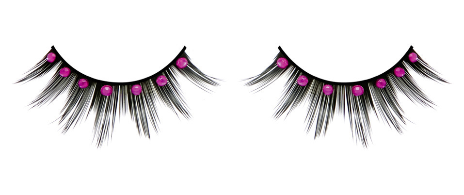 - Эффектный дизайн: Черные реснички разной длины создают объем, а ярко-розовые круглые стразы добавляют блеска и цвета.