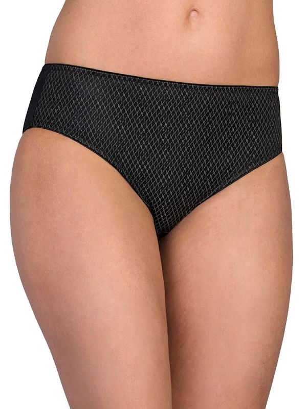 Средняя посадка обеспечивает комфортную фиксацию без излишнего давления в области талии. Задняя часть выполнена из однотонной шелковистой микрофибры, которая приятно ощущается на коже и способствует свободе движений в течение дня. Передняя панель дополнена аккуратным геометрическим узором, придающим модели современный и женственный характер.