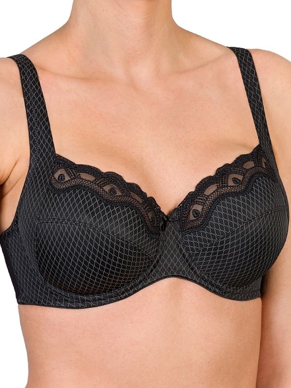 Неброский геометрический принт в виде ромбов на матовом симплексе придает модели современный и аккуратный вид. Верх чашек украшен полупрозрачным кружевом с фестончатым краем, а небольшой декоративный бант по центру добавляет женственный акцент. Черный цвет делает бюстгальтер универсальным вариантом под повседневную и деловую одежду.