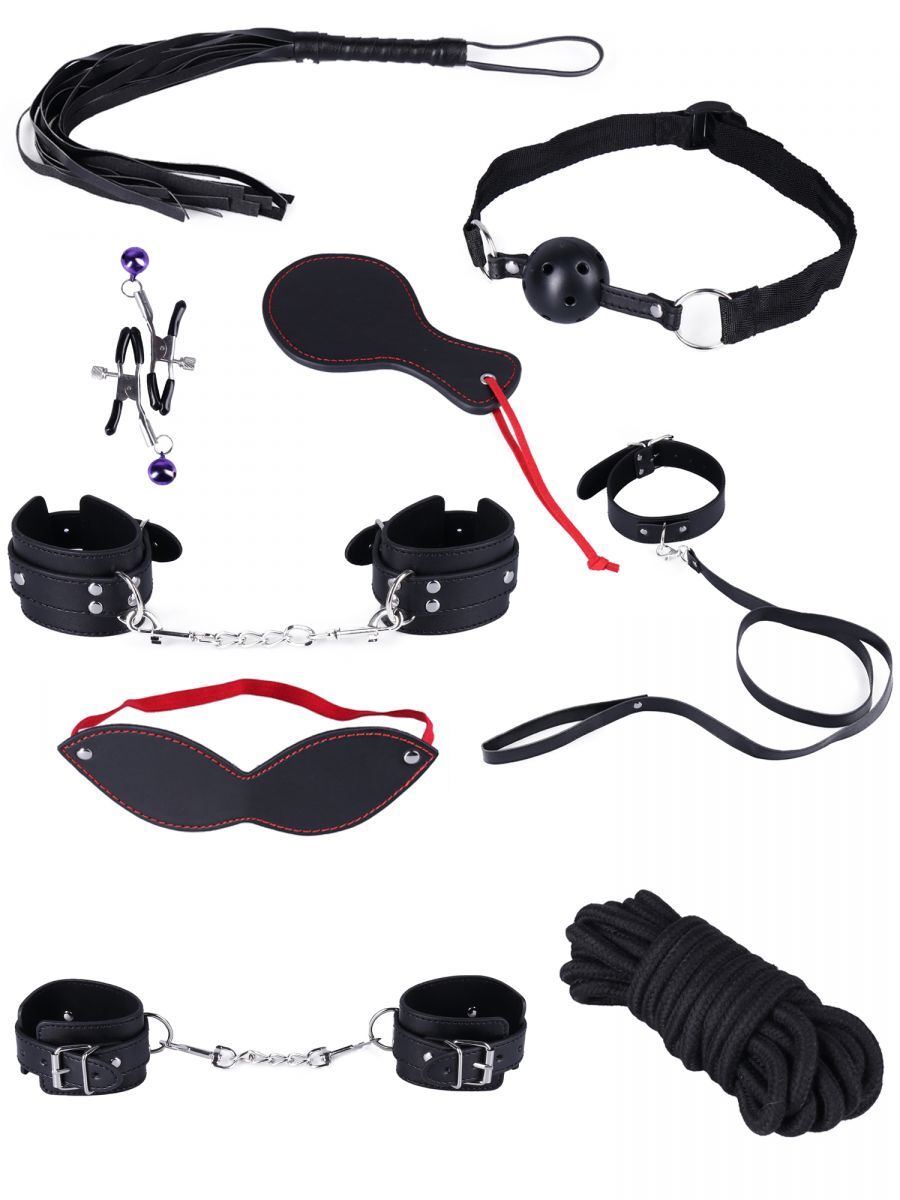 Набор включает в себя 10 различных аксессуаров, таких как плеть-флоггер, наручники, ошейник с поводком, маска, кляп, зажимы для сосков и многое другое. Каждый элемент можно использовать по отдельности или в комбинации, что позволяет вам создавать уникальные сценарии и наслаждаться игрой в полной мере. Набор подходит как для новичков, так и для опытных любителей БДСМ.