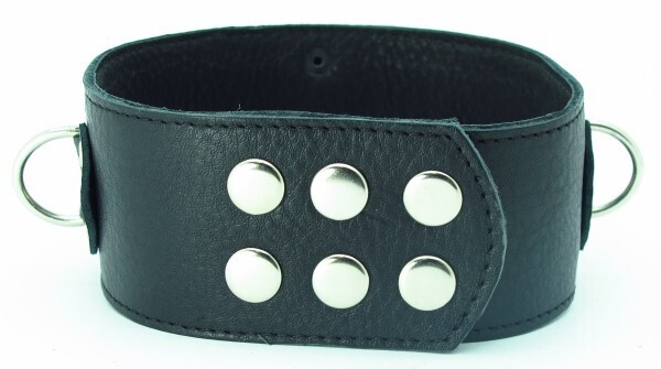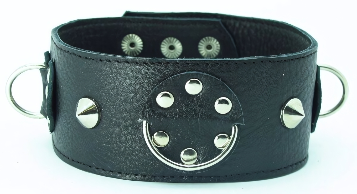 Ошейник кожаный черный с металлическими кольцами и клепками, ширина 5см, регулируемый