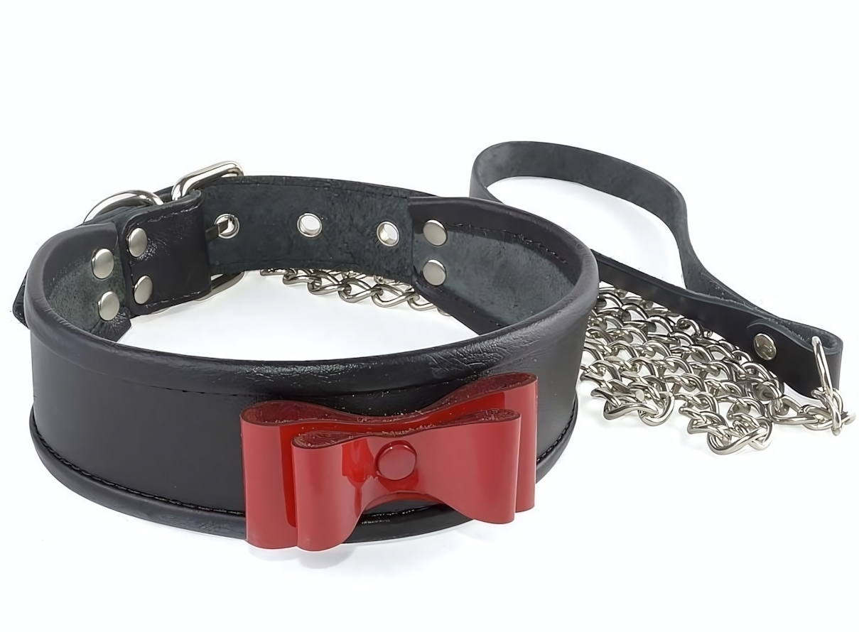 Черный кожаный ошейник с эффектным красным бантом создан для тех, кто ценит качество и эстетику в аксессуарах для особенных моментов. Плотная натуральная кожа обеспечивает долговечность, а мягкая оторочка гарантирует комфорт при ношении.