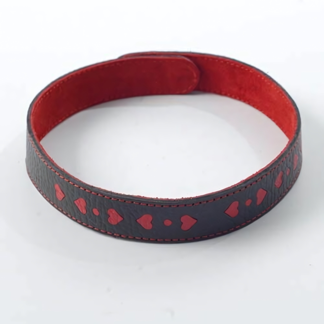 Ошейник кожаный с велюровой подкладкой, черный с красными сердечками, универсальный размер 2 см, Sitabella