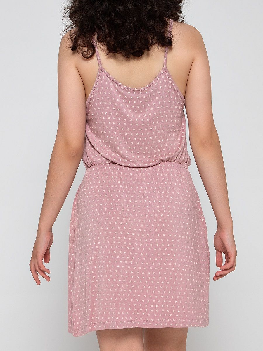 Модель универсальна: она прекрасно подходит для дома, утреннего кофе на веранде или прогулок по парку. Романтичный принт в виде мелких сердечек добавляет игривости образу.