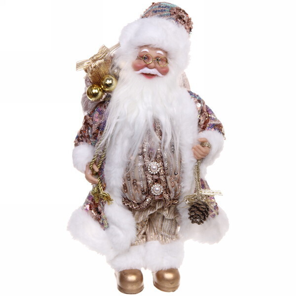 Фигурка Деда Мороза высотой около 30 см — стильное и заметное украшение для вашего дома, офиса или праздничного пространства. Декоративная шуба с нежным розовым оттенком и блестящими золотыми деталями создает ощущение уюта и волшебства. Яркое исполнение, белая пушистая борода и очки добавляют образу дружелюбия, чтобы каждый гость почувствовал приближение праздника с первых секунд.