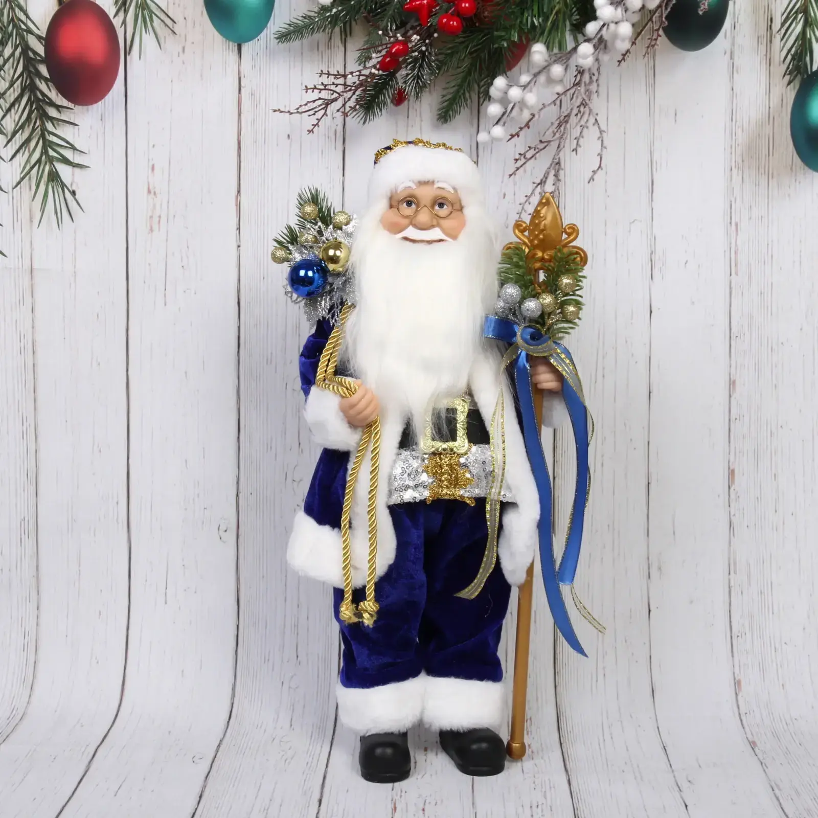 Эта очаровательная фигурка высотой 45 см станет идеальным украшением вашего дома к Новому году. Богатый синий цвет шубы с белоснежными меховыми вставками создает роскошный образ, а золотые акценты добавляют нотку волшебства.