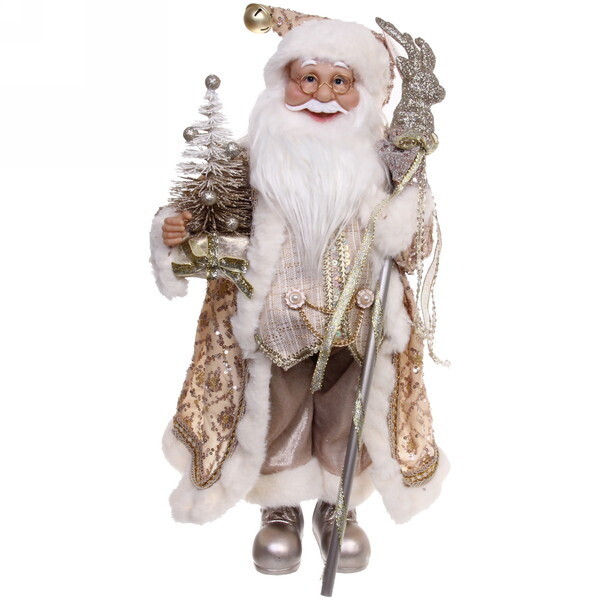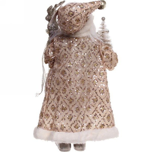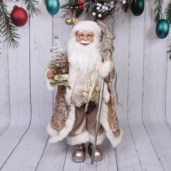 Добавьте в дом атмосферу настоящей зимней сказки с фигуркой дед мороза высотой 45 см. Роскошная золотая шуба с изысканной вышивкой и блестящими деталями сразу создаст праздничное настроение и привлечёт внимание гостей. Этот дед мороз держит украшенную мини-ёлку и посох с декоративными элементами — всё для создания неповторимой новогодней атмосферы.