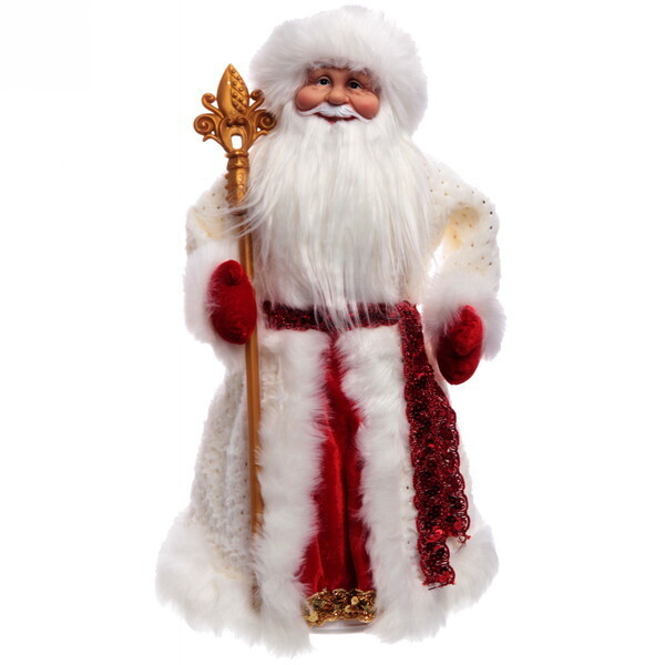 Этот очаровательный Дед Мороз высотой 50 см станет настоящим украшением вашего дома в новогодние праздники. Его белая шуба с меховыми рукавами и красные элементы придают ему особый шарм и уют. Он не только радует глаз, но и имеет практичное отделение для конфет или подарков, что делает его идеальным для создания праздничной атмосферы.