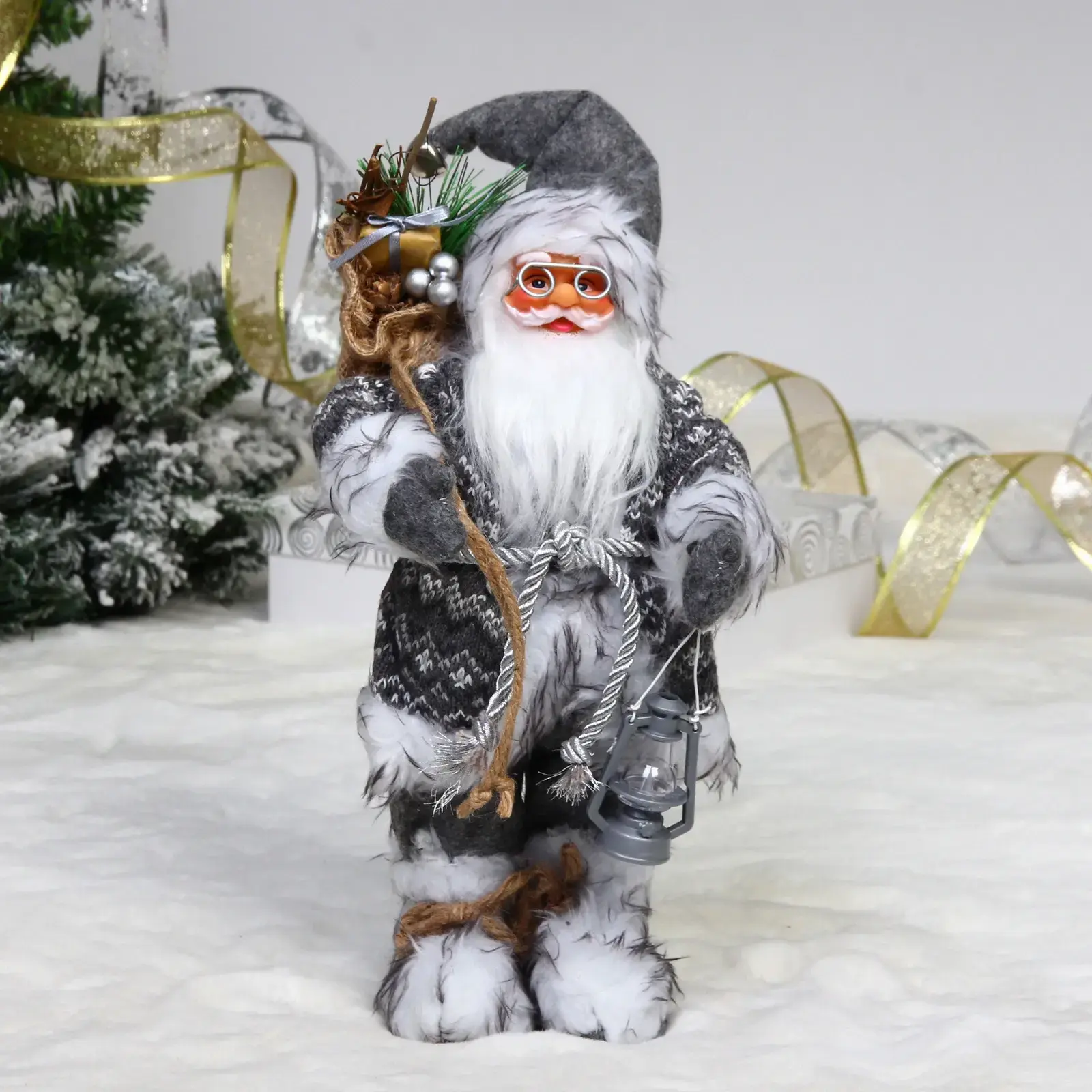 Фигурка изготовлена в элегантной серо-белой цветовой гамме, которая отлично сочетается с любым новогодним декором.