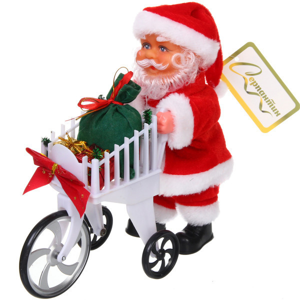 Фигурка выполнена в ярких цветах и имеет реалистичные детали, такие как длинная белая борода и улыбающееся лицо. Тележка белого цвета с черными колесами добавляет оригинальности и завершает образ. Размеры фигурки делают её идеальной для размещения на полках, столах или под ёлкой.