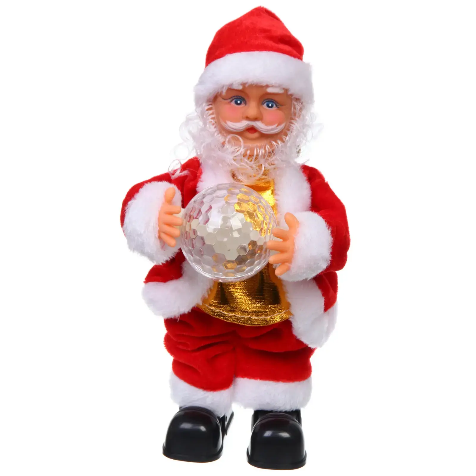 Размеры фигурки составляют 30 см в высоту, что делает ее заметной, но не слишком громоздкой. Красный цвет костюма с белыми вставками и блестящий шар создают праздничное настроение. Дед Мороз выполнен в традиционном стиле, что делает его универсальным для любого новогоднего оформления.