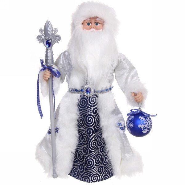 Размеры: высота 50 см. Материалы: текстиль и пластик. Дед Мороз имеет музыкальную функцию, что добавляет ему особую привлекательность. Его наряд украшен спиралевидным узором, а в руках он держит синий шарик и серебряный жезл, что делает его образ завершенным и гармоничным.