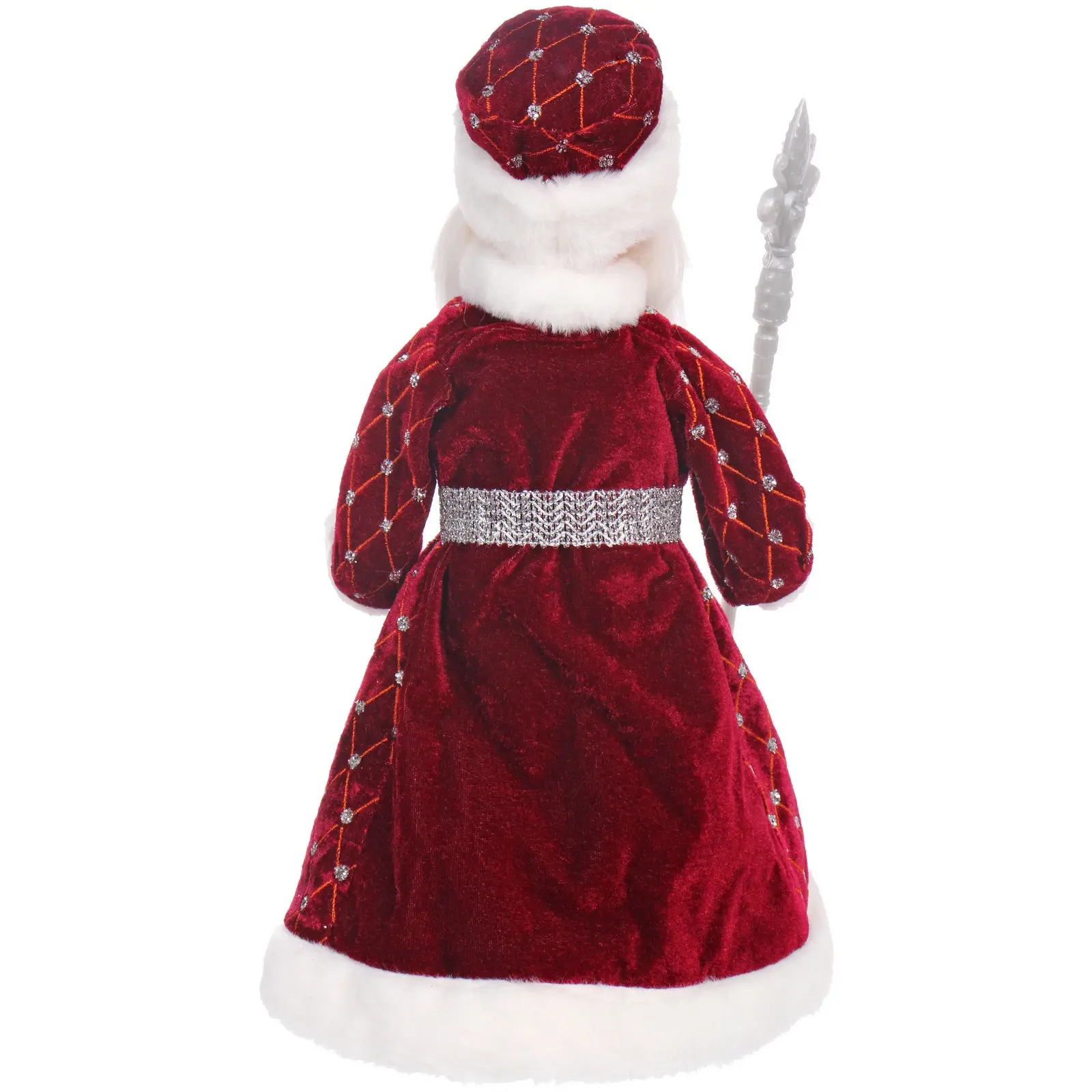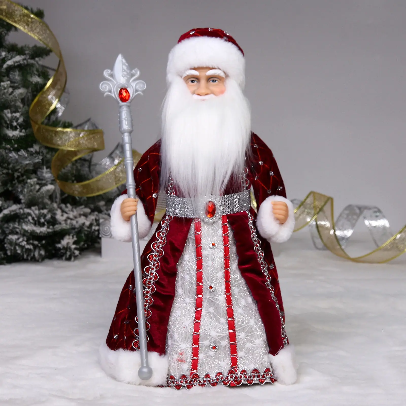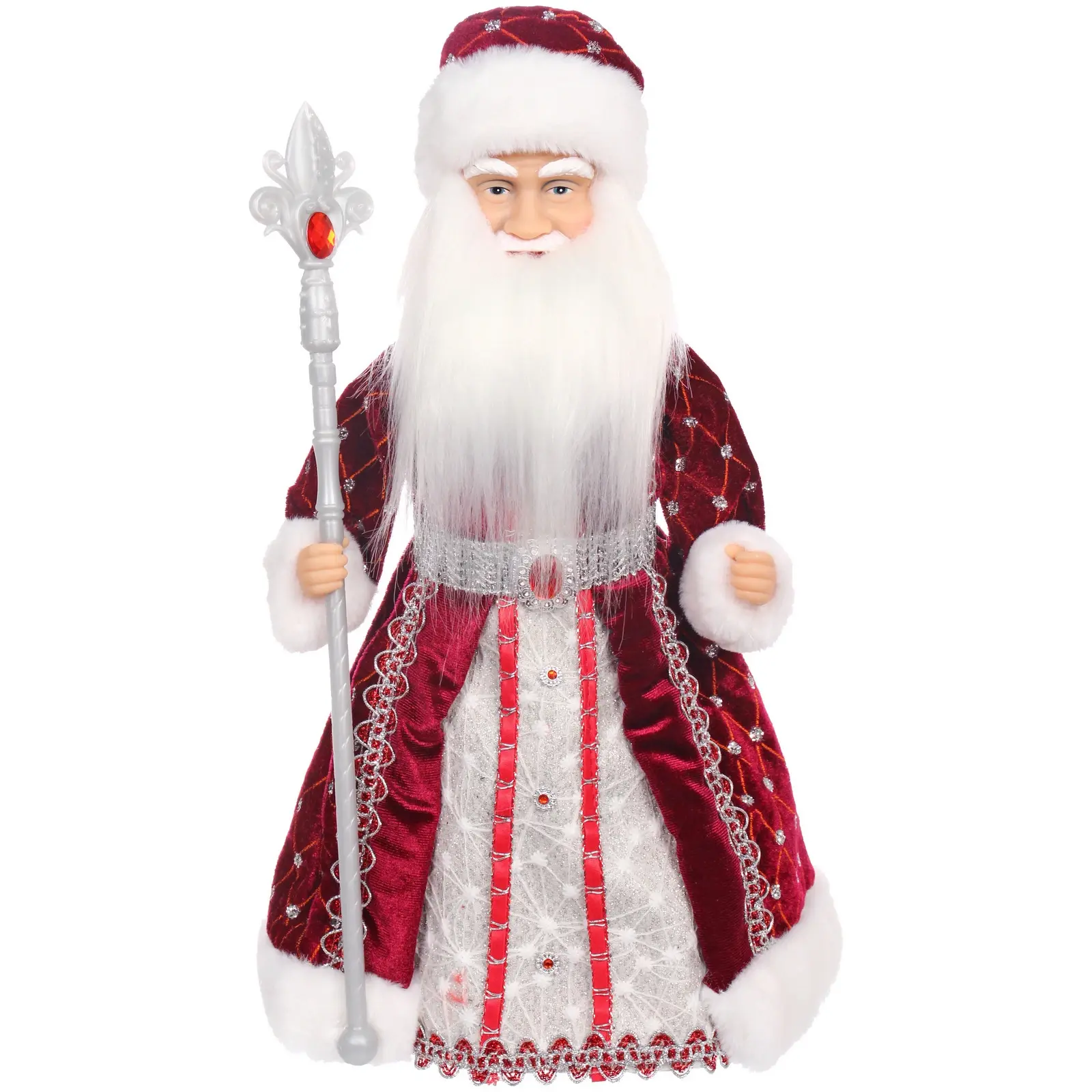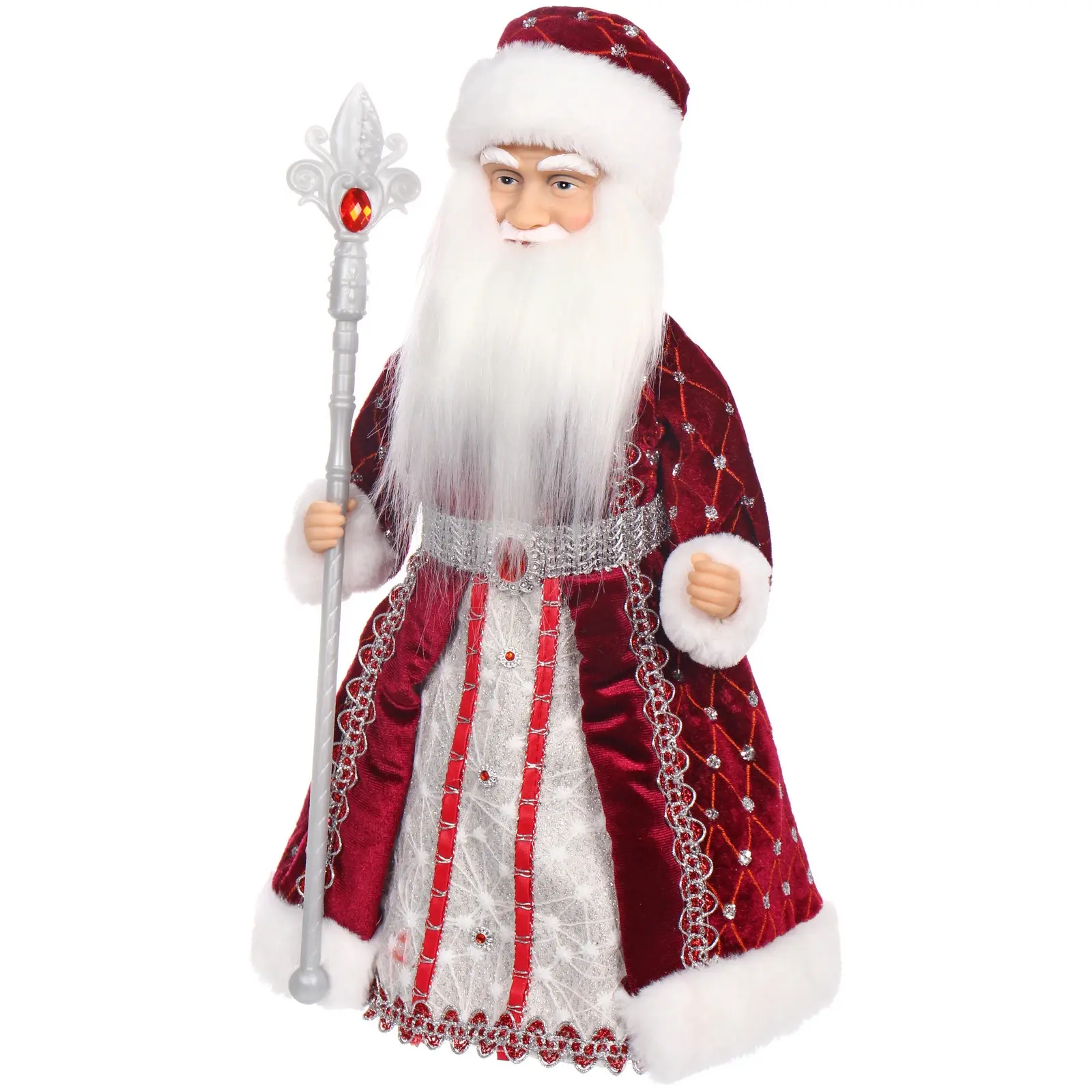 Фигурка выполнена из качественного текстиля и пластика, что делает ее прочной и долговечной. Яркая бордовая шубка, украшенная белым мехом и блестящими элементами, выглядит очень эффектно и стильно. Размер в 40 см позволяет легко разместить ее в любом уголке вашего дома: на праздничном столе, под елкой или на полке. Она станет отличным подарком для детей и взрослых!