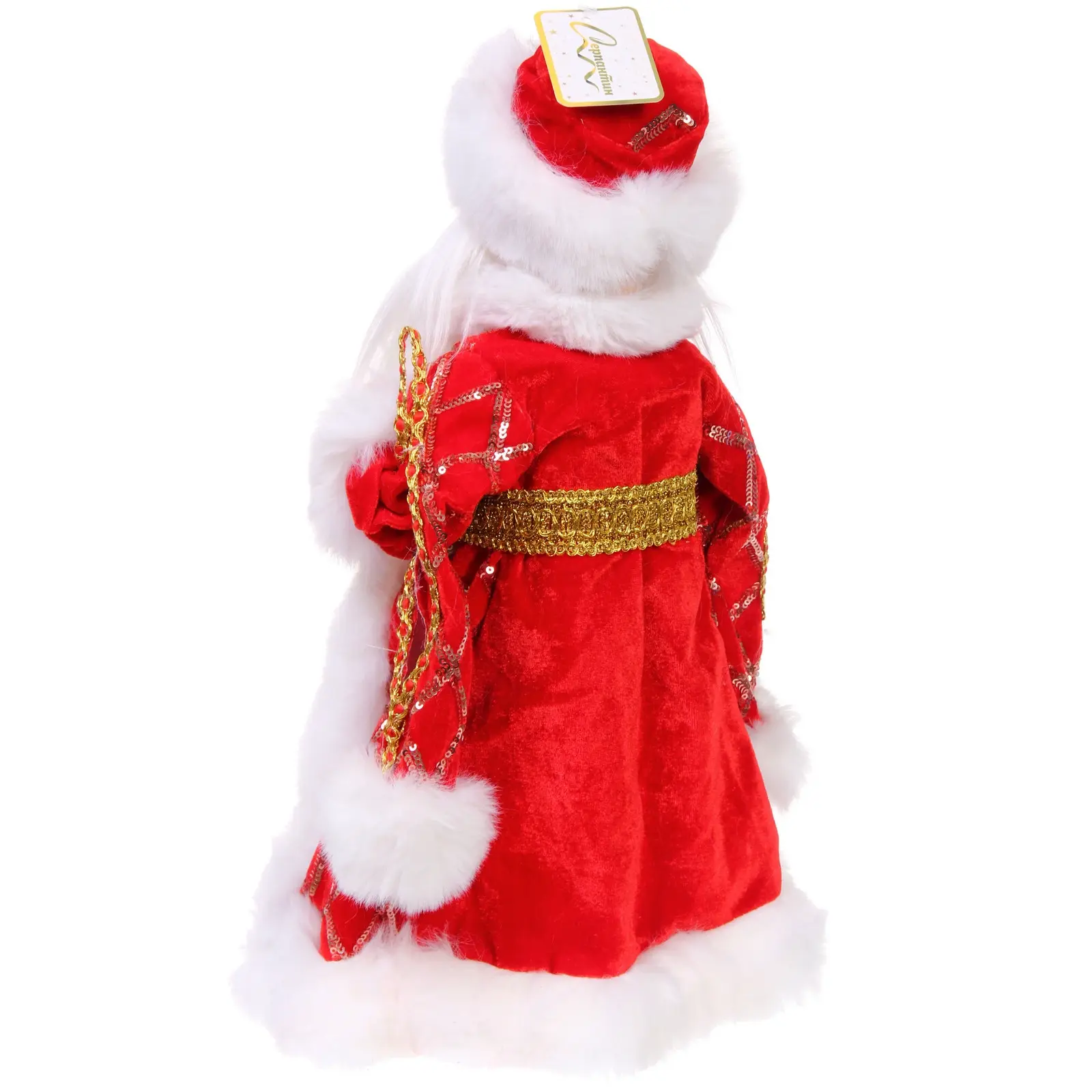 Фигурка имеет традиционную форму с характерными чертами: длинная белая борода, красный костюм с золотыми деталями и меховая отделка. В одной руке Дед Мороз держит посох с золотой верхушкой, что добавляет ему торжественности. Размеры фигурки: высота 40 см, что делает ее заметной и привлекательной в любом интерьере.