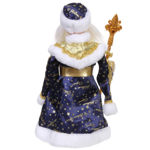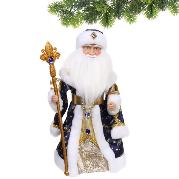 Фигурка имеет высоту 40 см и выполнена в традиционном стиле, что делает её подходящей для любого интерьера. Синий цвет халата и золотые детали делают её яркой и запоминающейся. Дед Мороз держит жезл с золотой верхушкой, что подчеркивает его статус зимнего волшебника. Эта фигурка станет отличным подарком для близких и друзей, а также прекрасным дополнением к вашему новогоднему декору.