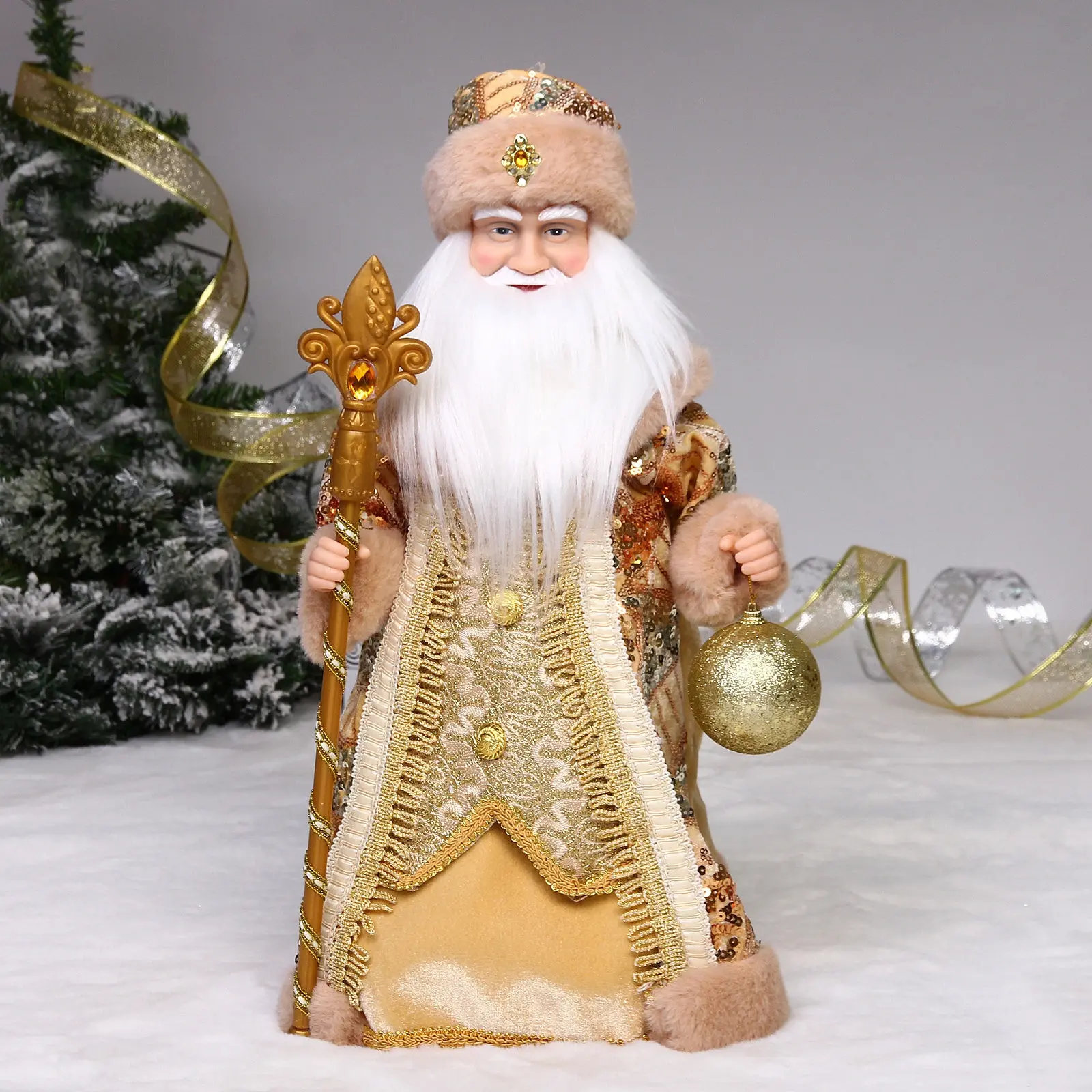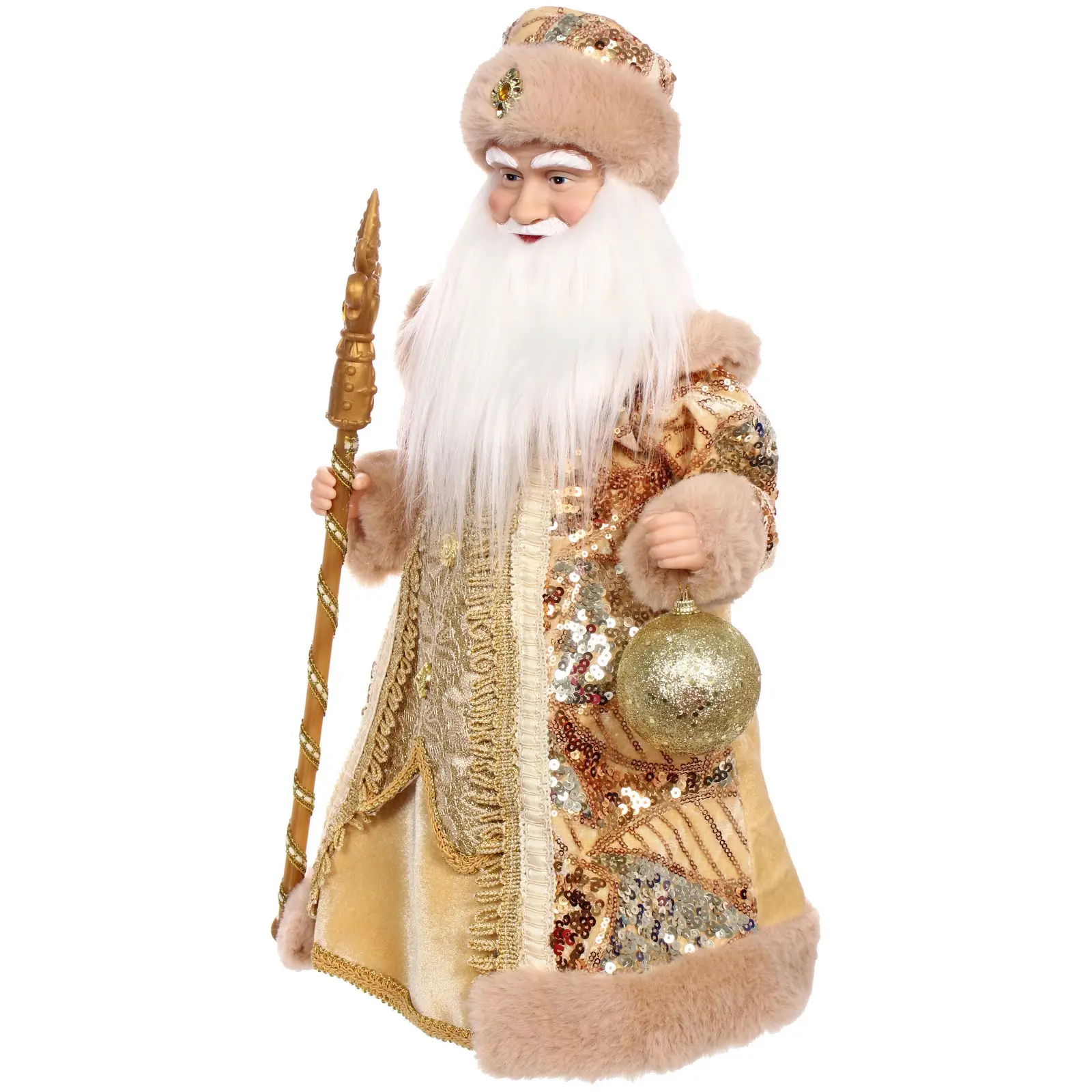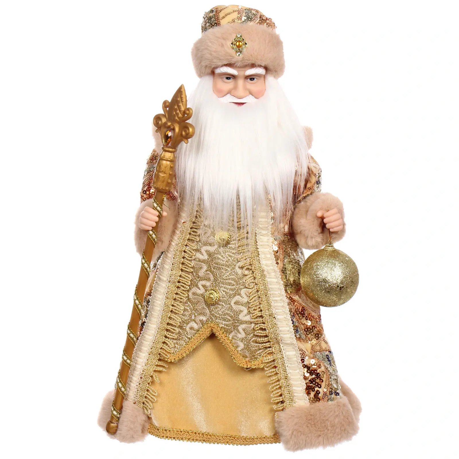Фигурка выполнена из качественного текстиля и пластика, что делает ее долговечной и надежной. Блестящие элементы и сложная текстура одежды подчеркивают ее праздничный вид. Дед Мороз, держащий жезл и шар, легко впишется в новогоднюю атмосферу, привнося в ваш дом яркие эмоции и радость.