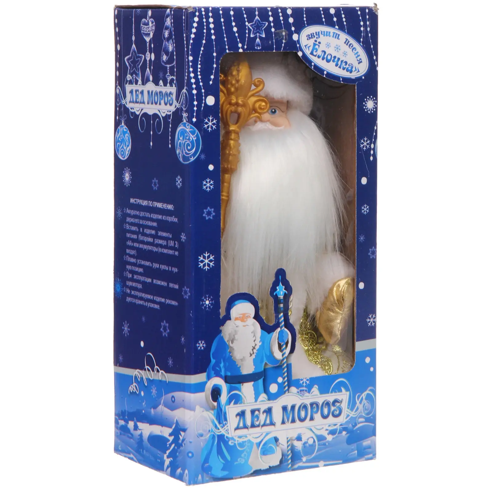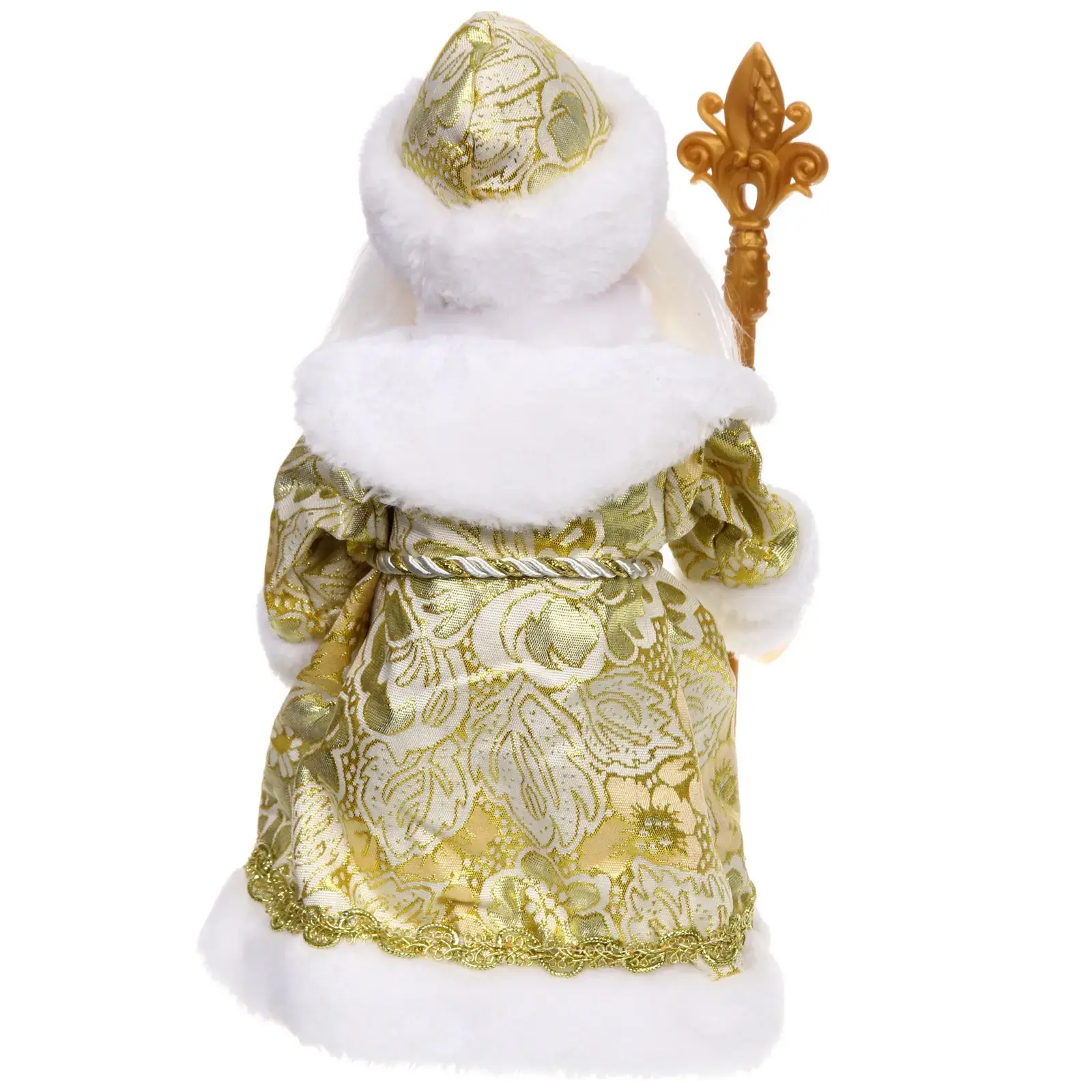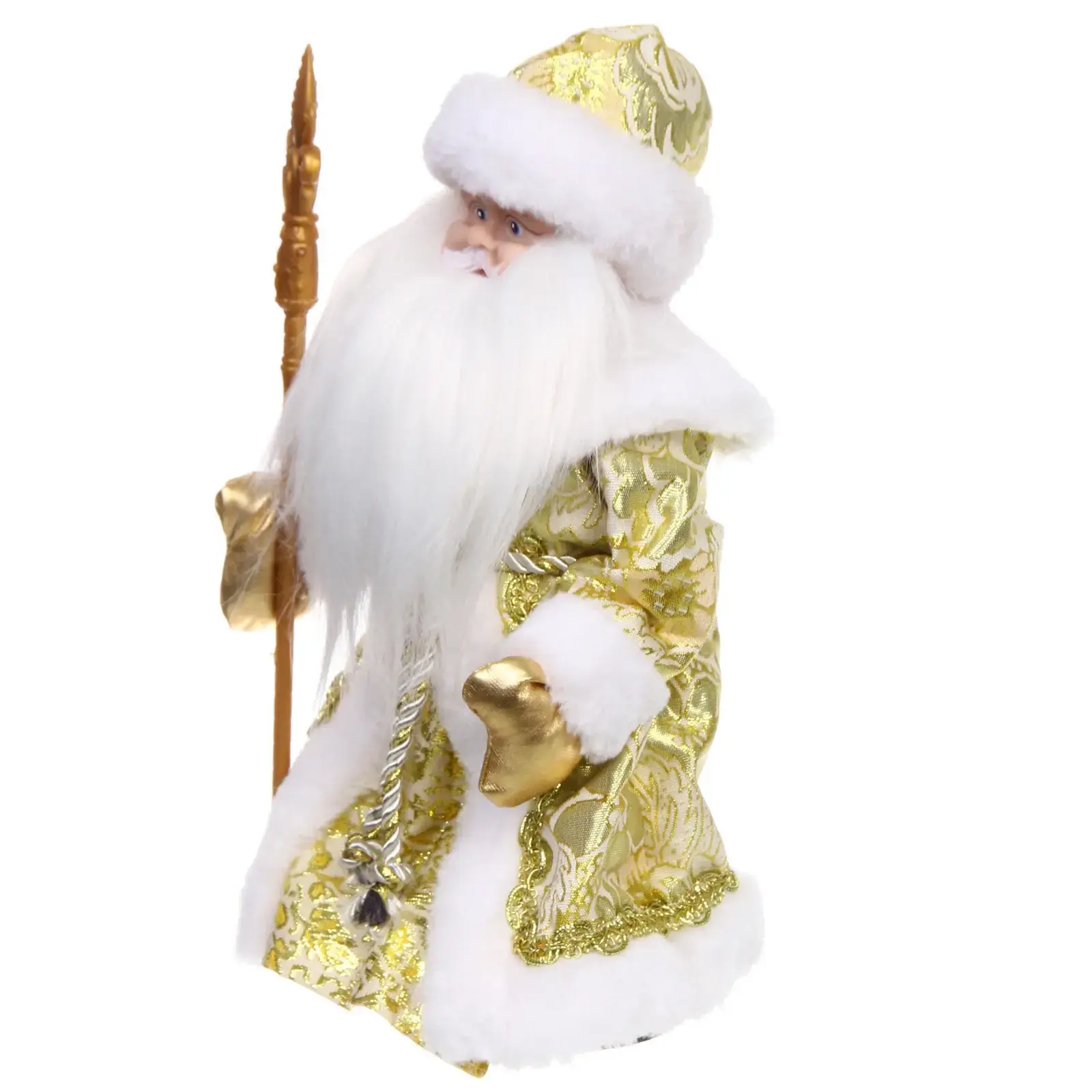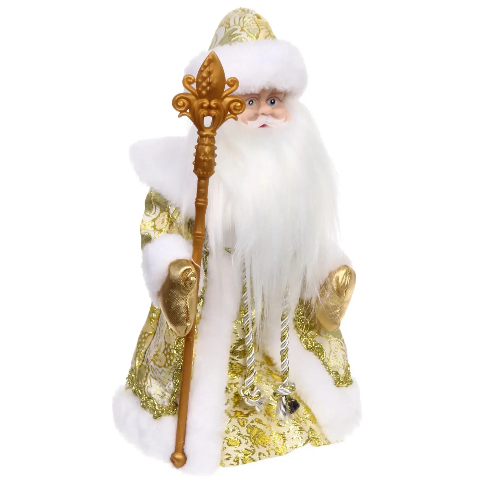 Фигурка имеет высоту 30 см и выполнена в золотистом цвете с белыми меховыми вставками. Она украшена длинной белой бородой и держит посох с золотой верхушкой, что добавляет ей волшебства. Эта фигурка станет не только украшением, но и символом надежды и радости в новогодние праздники.