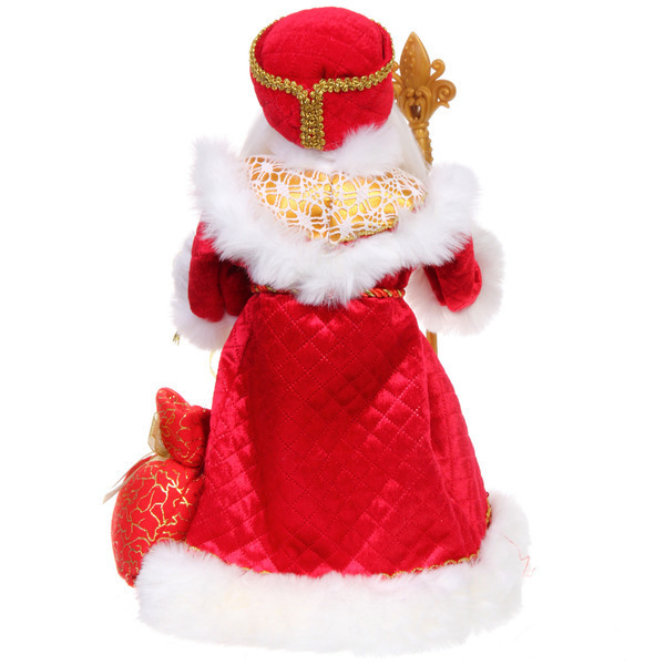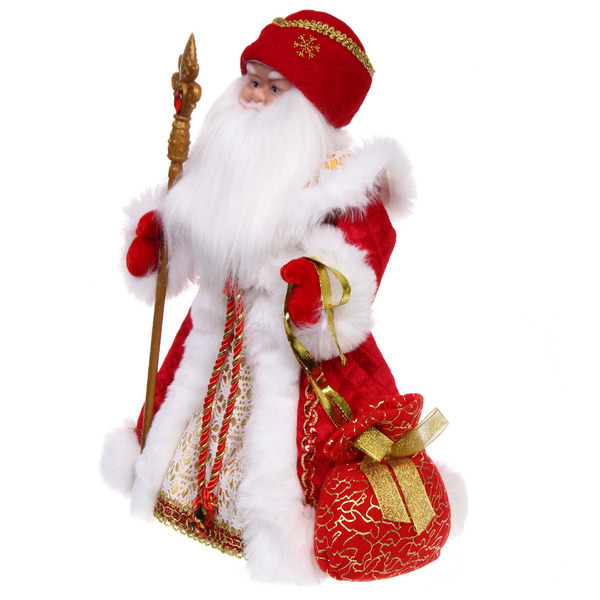 Фигурка выполнена в красных и белых тонах, украшена золотыми элементами, что придает ей особый шарм. В руках Дед Мороз держит мешок с подарками, что добавляет дополнительный элемент праздника. Высота фигурки составляет 40 см, что делает ее заметной и привлекательной в любом интерьере.