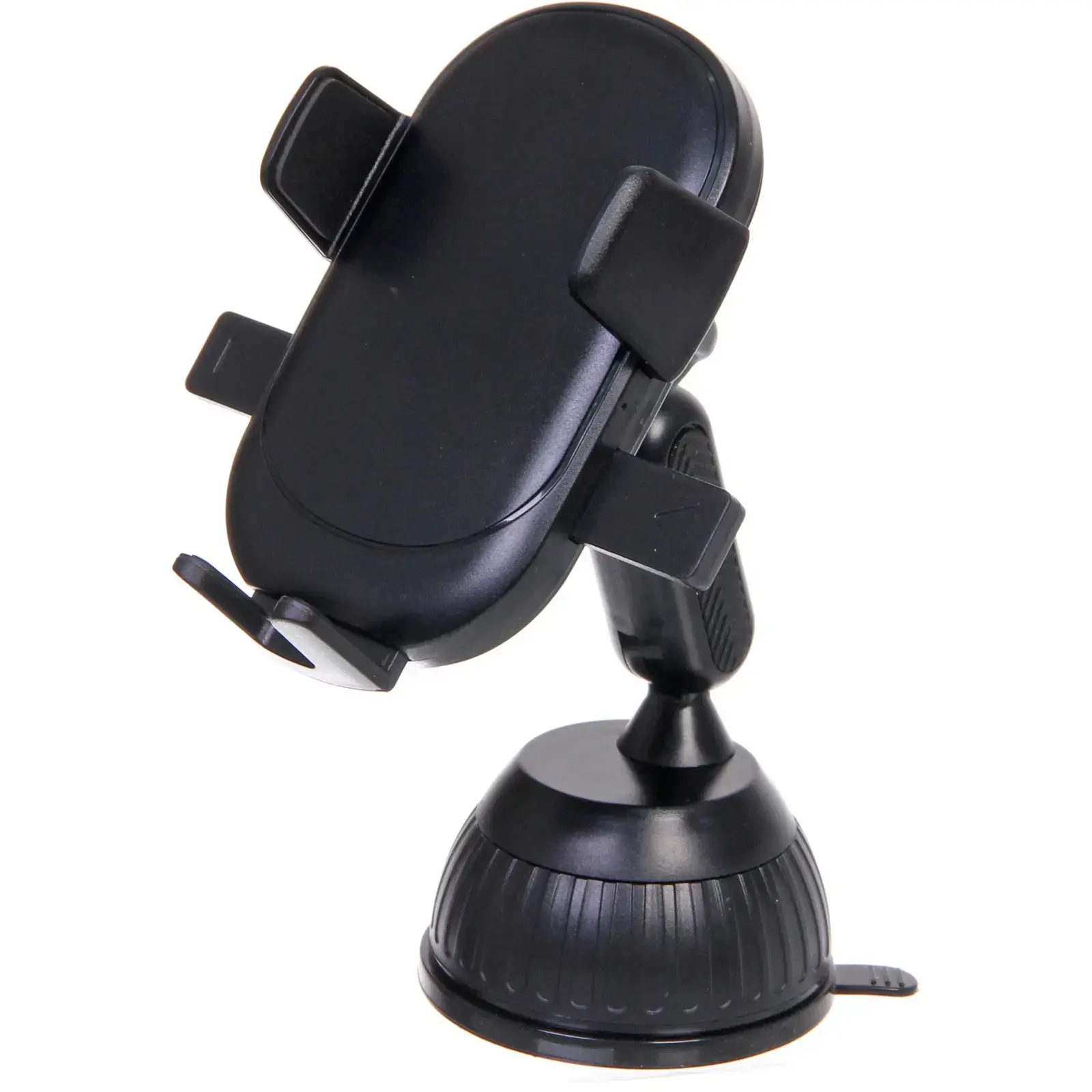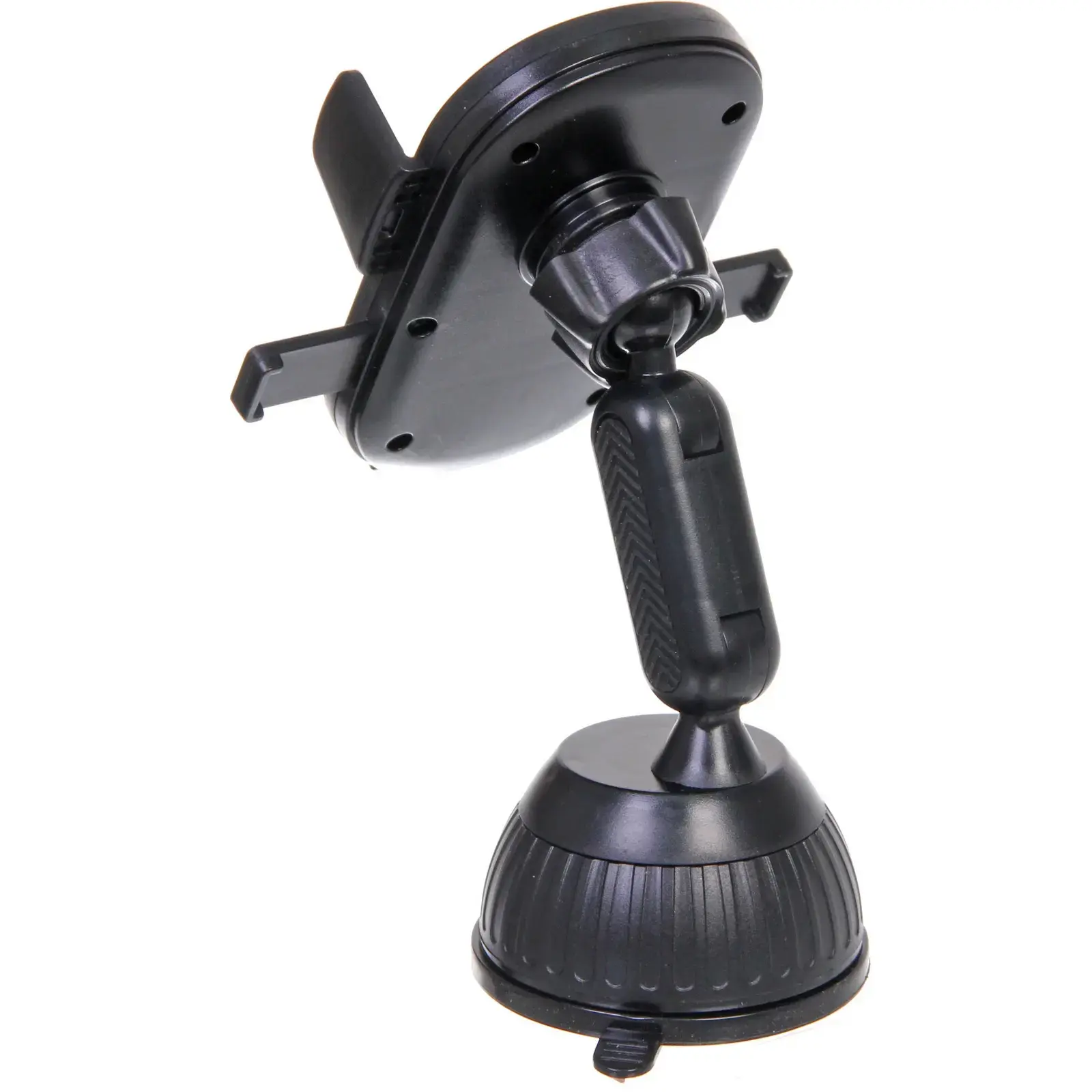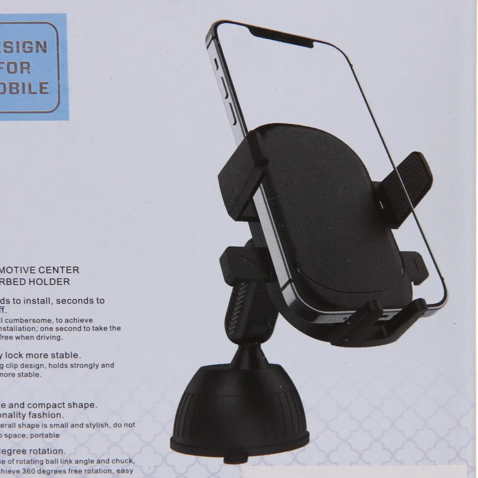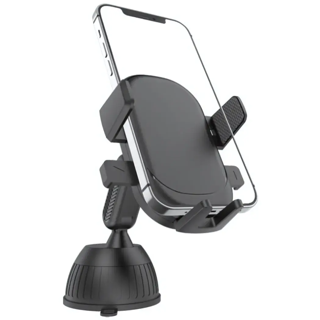 Держатель имеет черный цвет и округлую форму с боковыми захватами для надежной фиксации устройства. Присоска обеспечивает стабильное крепление на стекле, а механизм поворота на 360 градусов позволяет легко изменять угол обзора. Размеры держателя оптимальны для большинства автомобилей, а его компактный дизайн не занимает много места в салоне.
