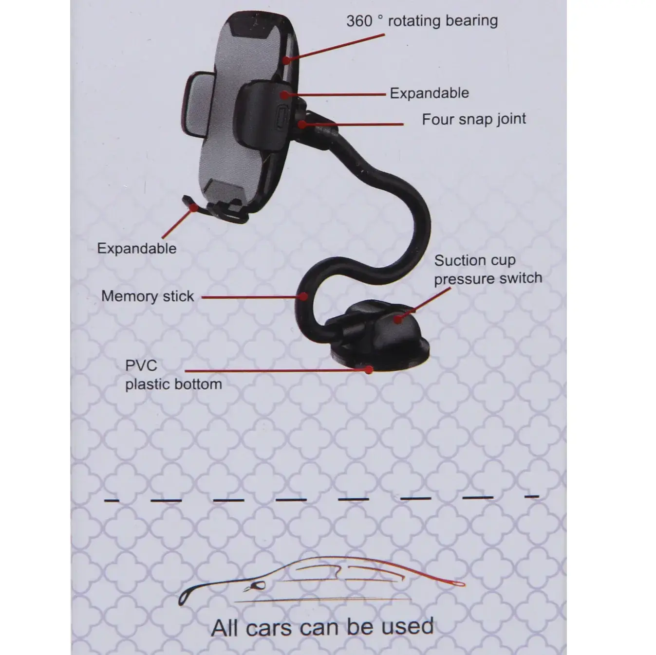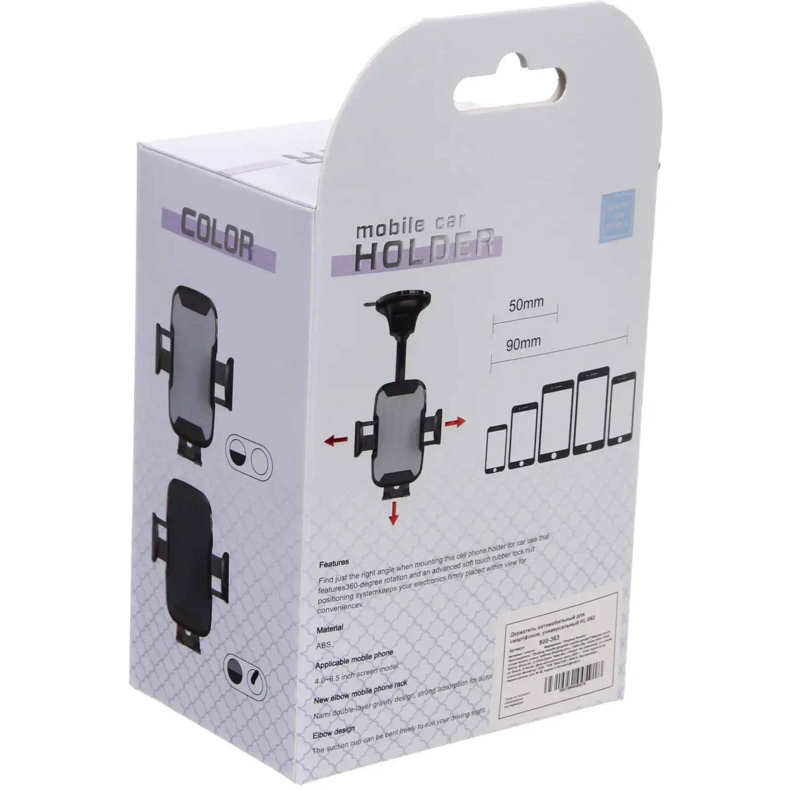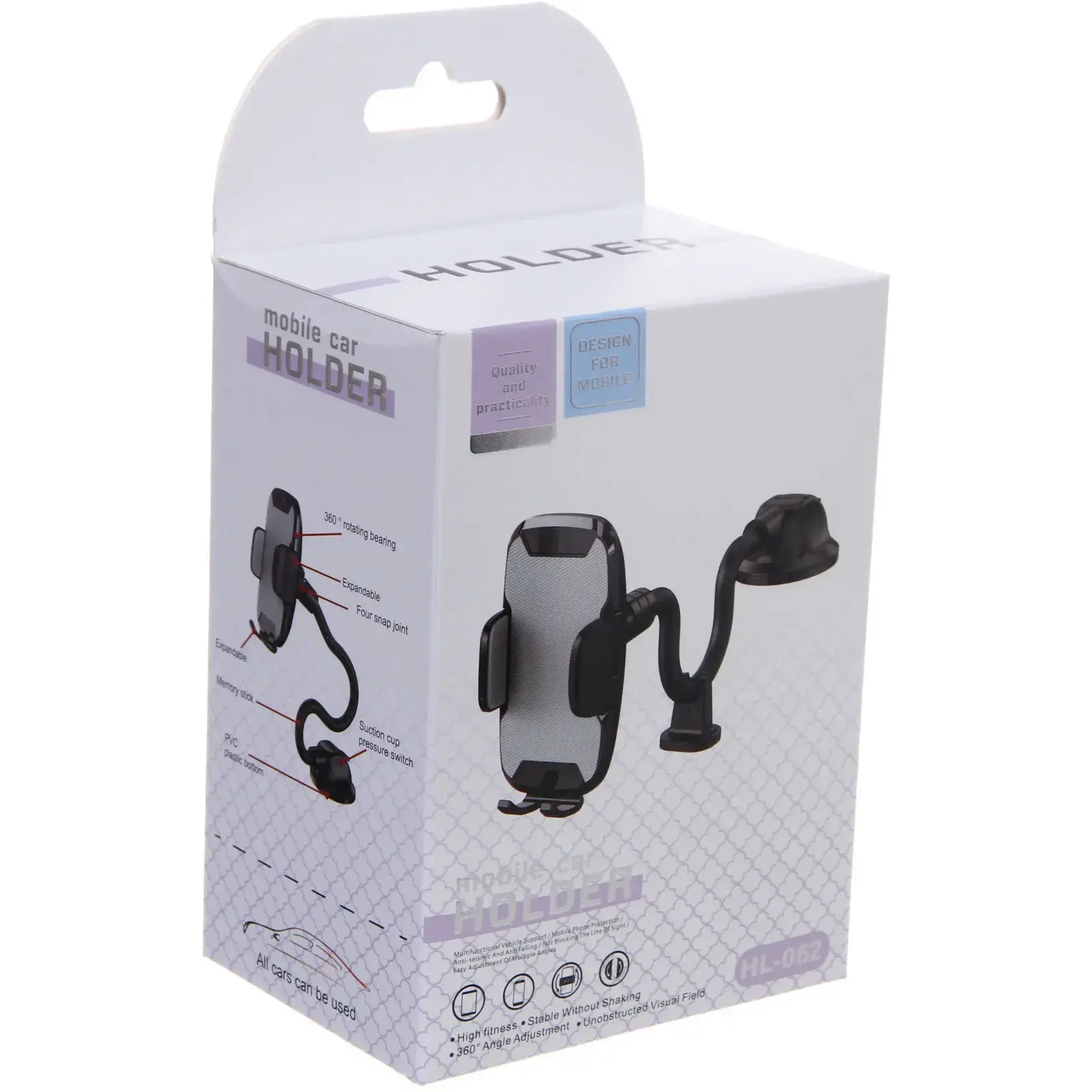 Размеры держателя позволяют использовать его с телефонами шириной от 50 до 90 мм. Присоска обеспечивает надежное крепление, а гибкая штанга позволяет легко изменять угол наклона для оптимального обзора. Держатель HL-062 — это не только удобство, но и безопасность, позволяющая вам сосредоточиться на вождении, не отвлекаясь на телефон.