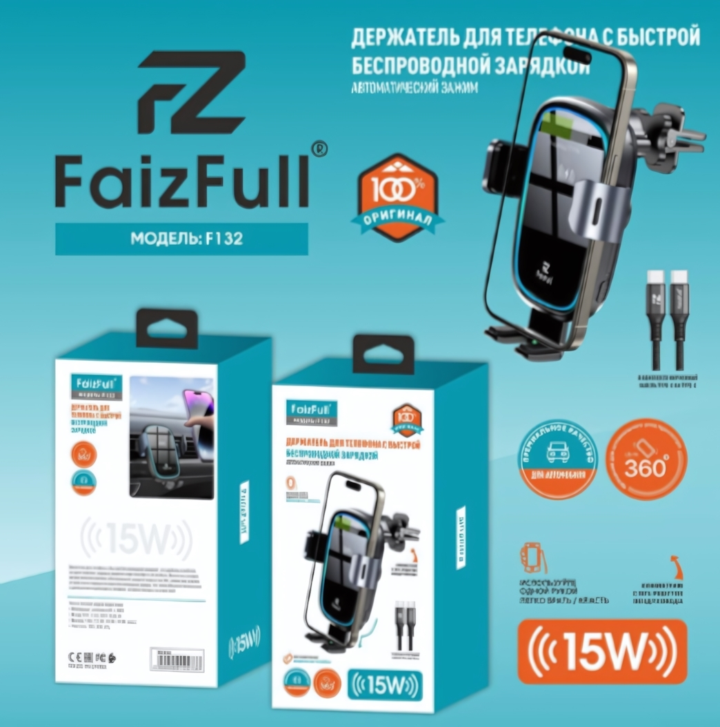 Автомобильный держатель FaizFull F132 сочетает стильный дизайн с инновационной функциональностью. Быстрая беспроводная зарядка 15Вт избавит вас от проводов, а надежное крепление гарантирует устойчивость даже на неровных дорогах.