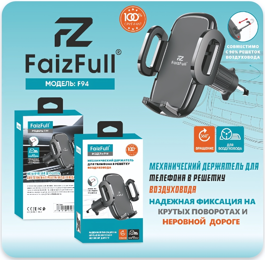 Держатель FaizFull F94 обеспечивает безопасное размещение вашего смартфона в салоне автомобиля. Устойчивая конструкция с 360-градусным вращением позволяет удобно расположить устройство для навигации или видеозвонков.